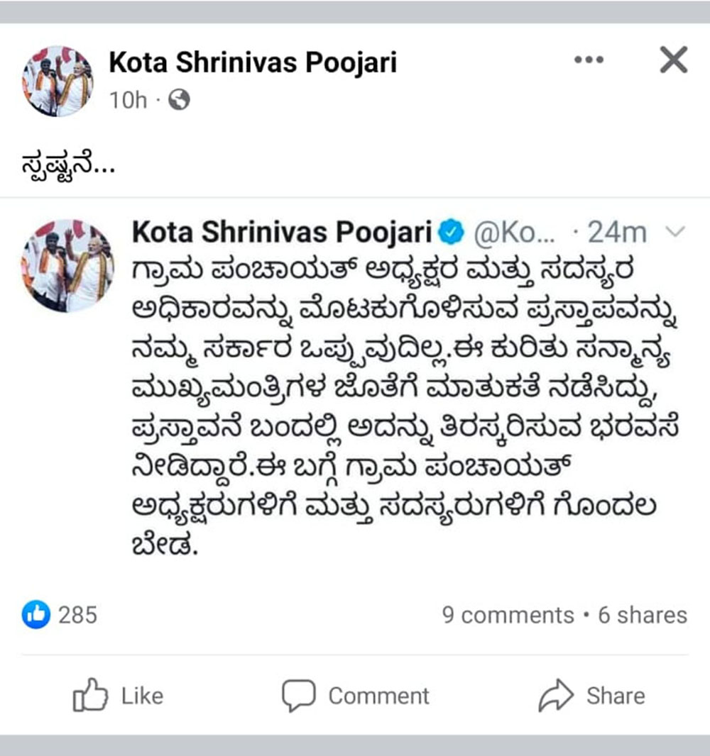 ಅಧಿಕಾರ ಮೊಟಕು ಇಲ್ಲ: ರಾಜ್ಯದ ಗ್ರಾಮ ಪಂಚಾಯತ್ ಅಧ್ಯಕ್ಷರು ಮತ್ತು ಸದಸ್ಯರ ಅಧಿಕಾರವನ್ನು ಮೊಟಕುಗೊಳಿಸುವುದಿಲ್ಲವೆಂದು ಮುಖ್ಯಮಂತ್ರಿಗಳು ಸ್ಪಷ್ಟಪಡಿಸಿದ್ದಾರೆ ಉಡುಪಿ ಜಿಲ್ಲಾ ಬಿಜೆಪಿ ಪಂಚಾಯತ್ ರಾಜ್ ಪ್ರಕೋಷ್ಠದ ಸಂಚಾಲಕ ರಾಜೀವ ಕುಲಾಲ್ ಪ್ರಕಟಣೆಯಲ್ಲಿ ತಿಳಿಸಿದ್ದಾರೆ.