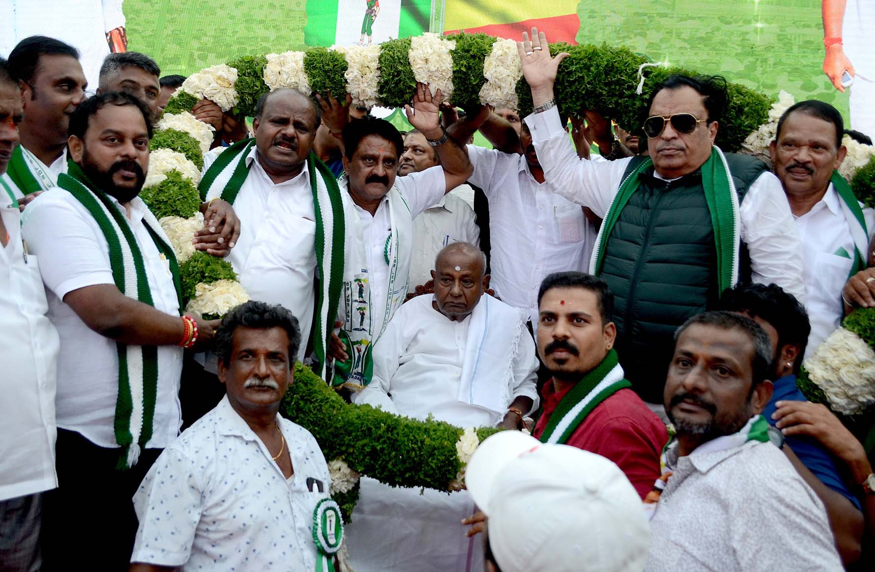 ನಮ್ಮ ಪಕ್ಷದಿಂದ ಹೊರಗೆ ಹೋದವರು ತುಂಬಾ ಜನ ಇದ್ದಾರೆ. ನನ್ನ ಬಗ್ಗೆ ಯಾರು ಏನೇ ಮಾತನಾಡಿದರೂ ಪರವಾಗಿಲ್ಲ. ಈ ಪಕ್ಷ ಉಳಿಸಲು ನೀವು ಶಕ್ತಿ ಕೊಡಬೇಕು. ನನ್ನ ಕಣ್ಣ ಮುಂದೆ ಜೆಡಿಎಸ್ ಅಧಿಕಾರಕ್ಕೆ ಬರುವುದು ಸತ್ಯ, ಕುಮಾರಸ್ವಾಮಿ ಮತ್ತೊಮ್ಮೆ ಮುಖ್ಯಮಂತ್ರಿ ಆಗುವುದು ಸತ್ಯ. ಈ ಬಗ್ಗೆ ಯಾರಿಗೂ ಸಂಶಯ ಬೇಡ ಎಂದು ದೇವೇಗೌಡ ಹೇಳಿದರು.