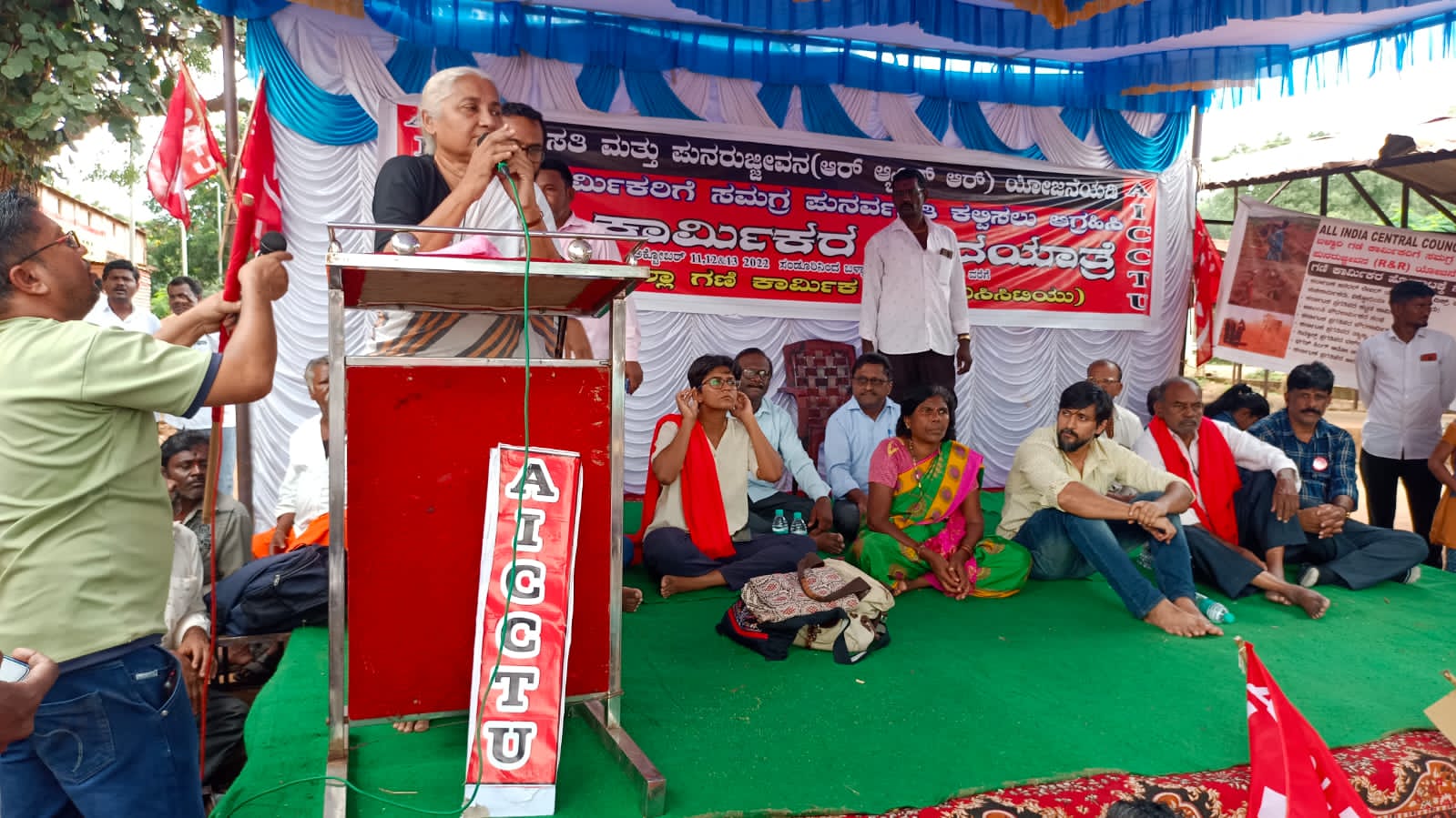 ''ಕೇಂದ್ರ ಸರಕಾರವು ಕಾರ್ಮಿಕರ ಎಲ್ಲ ಹಕ್ಕುಗಳನ್ನು ಕಸಿದುಕೊಳ್ಳಲು ಕಾರ್ಮಿಕ ಸಂಹಿತೆಗಳು ಜಾರಿಗೊಳಿಸಿದೆ. ದೇಶದಲ್ಲಿ ಎಲ್ಲವನ್ನೂ ಖಾಸಗೀಕರಣ ಮಾಡಿದ್ದರಿಂದ ಖಾಯಂ ಆಗಿದ್ದ ಅನೇಕ ಕಾರ್ಮಿಕರನ್ನು ಈಗ ಗುತ್ತಿಗೆ ಆಧಾರದಲ್ಲಿ ಕೆಲಸ ಮಾಡುವಂತಾಗಿದೆ. ಇದು ಸಂಪೂರ್ಣ ಹಿಂಸಾಚಾರವಾಗಿದೆ ಎಂದು ಅವರು, ತೆರಿಗೆ ರೂಪದಲ್ಲಿ ಸಂಗ್ರಹಿಸಿದ ಹಣದಲ್ಲಿ ಕಾರ್ಮಿಕರು, ಮಹಿಳೆಯರು, ಯುವಕರಿಗೆ ಪಾಲು ನೀಡಬೇಕು'' ಎಂದು ಆಗ್ರಹಿಸಿದರು.