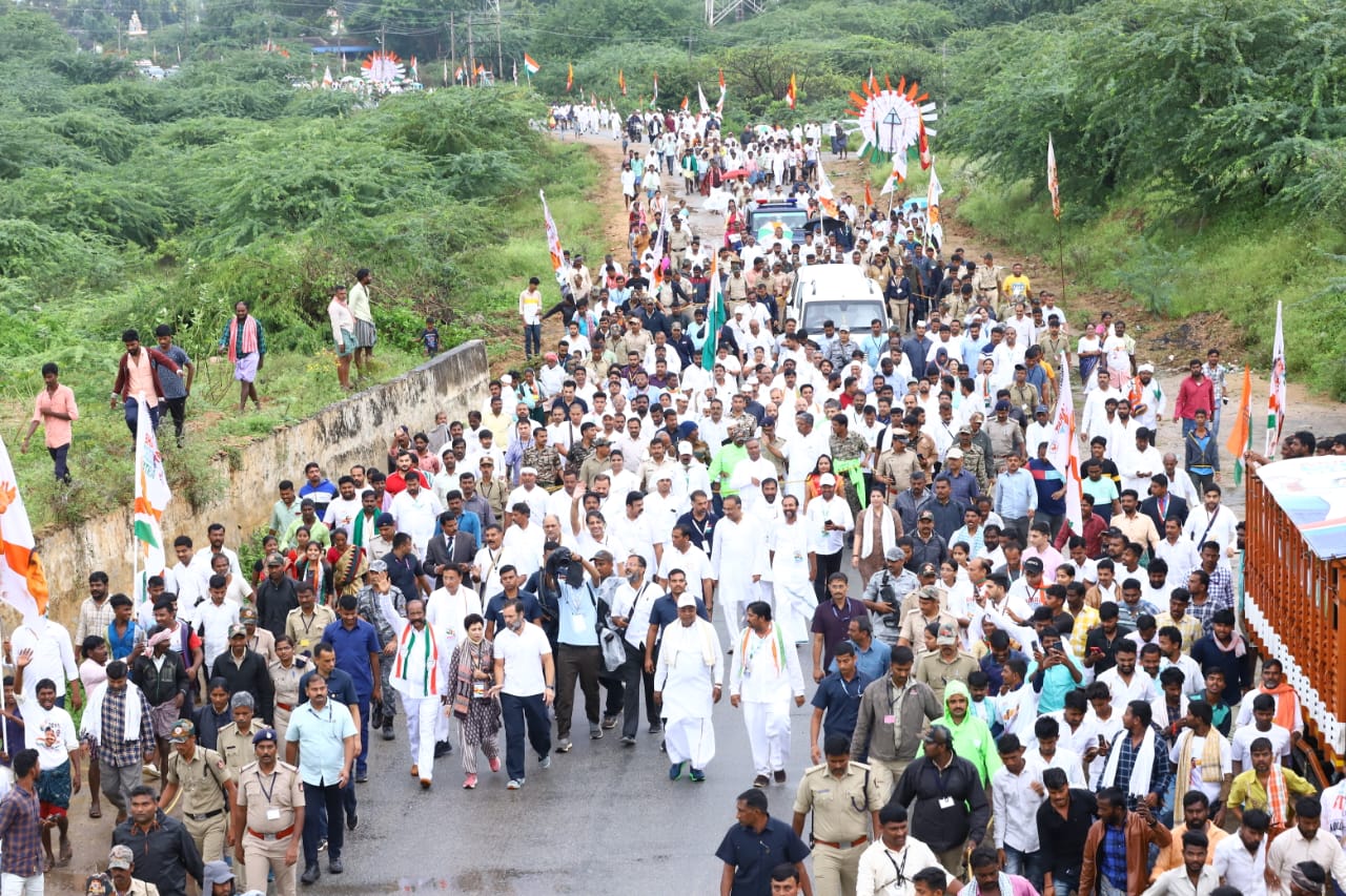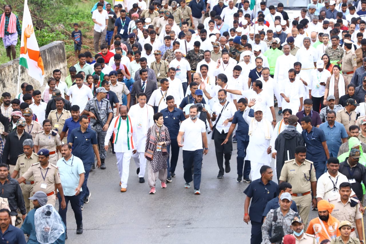 ಚಿತ್ರದುರ್ಗ: ಜಿಲ್ಲೆಯ ಚಳ್ಳಕೆರೆ ತಾಲೂಕಿನ ಬಿ.ಜಿ. ಕೆರೆ ಗ್ರಾಮದಿಂದ ಇಂದು ಬೆಳಗ್ಗೆ ರಾಹುಲ್ ಗಾಂಧಿಯವರು ಸೋನೆಮಳೆಯಲ್ಲಿ ನಡಿಗೆ ಆರಂಭಿಸಿದರು.
