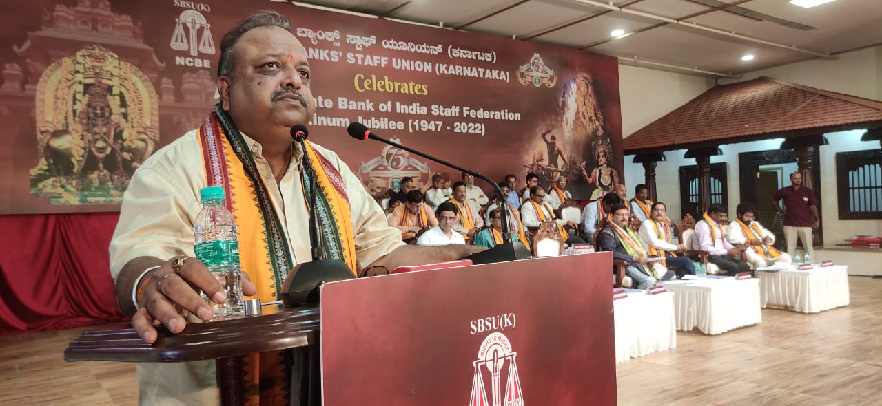 ಉಡುಪಿ, ಅ.16: ಸ್ಟೇಟ್ ಬ್ಯಾಂಕ್ಸ್ ಸ್ಟಾಫ್ ಯೂನಿಯನ್ (ಕರ್ನಾಟಕ) ಮಂಗಳೂರು ಮತ್ತು ಉಡುಪಿ ವಲಯಗಳ ಆತಿಥ್ಯದಲ್ಲಿ ‘ಅಖಿಲ ಭಾರತ ಸ್ಟೇಟ್ ಬ್ಯಾಂಕ್ ಆಫ್ ಇಂಡಿಯಾ ಸ್ಟಾಫ್ ಫೆಡರೇಶನ್’ ಇದರ ಅಮೃತ ಮಹೋತ್ಸವ ಸಂಭ್ರಮಾಚರಣೆಯು ಉಡುಪಿಯ ಅಮೃತ್ ಗಾರ್ಡನ್ ಸಭಾಂಗಣದಲ್ಲಿ ರವಿವಾರ ನಡೆಯಿತು.