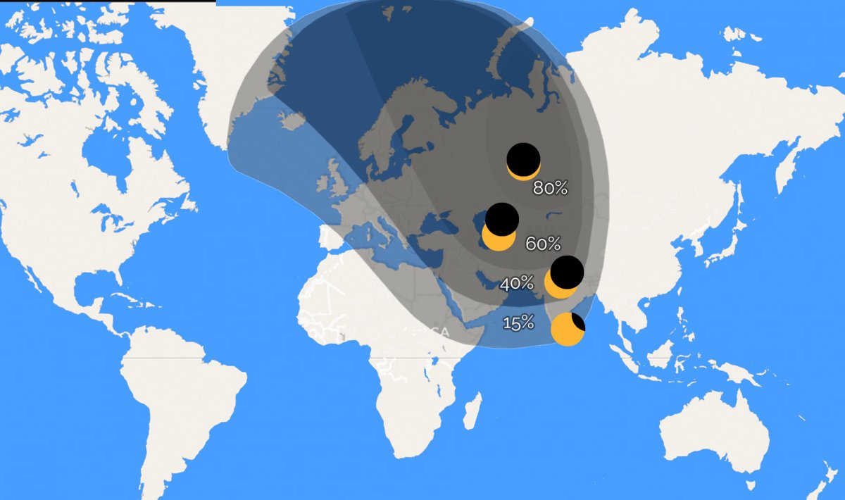 ಮಂಗಳವಾರ ಸಂಜೆ ಪ್ರಾರಂಭಗೊಳ್ಳುವ ಸೂರ್ಯಗ್ರಹಣ ವಿವಿಧ ಪ್ರಮಾಣದಲ್ಲಿ ಕಂಡುಬರುವ ವಿಶ್ವದ ಪಥ. ಭಾರತೀಯ ಕಾಲಮಾನದಂತೆ ಸಂಜೆ 4.58ಕ್ಕೆ ಪ್ರಾರಂಭಗೊಳ್ಳುವ ಗ್ರಹಣ 6.31ಕ್ಕೆ ಕೊನೆಗೊಳ್ಳಲಿದೆ.