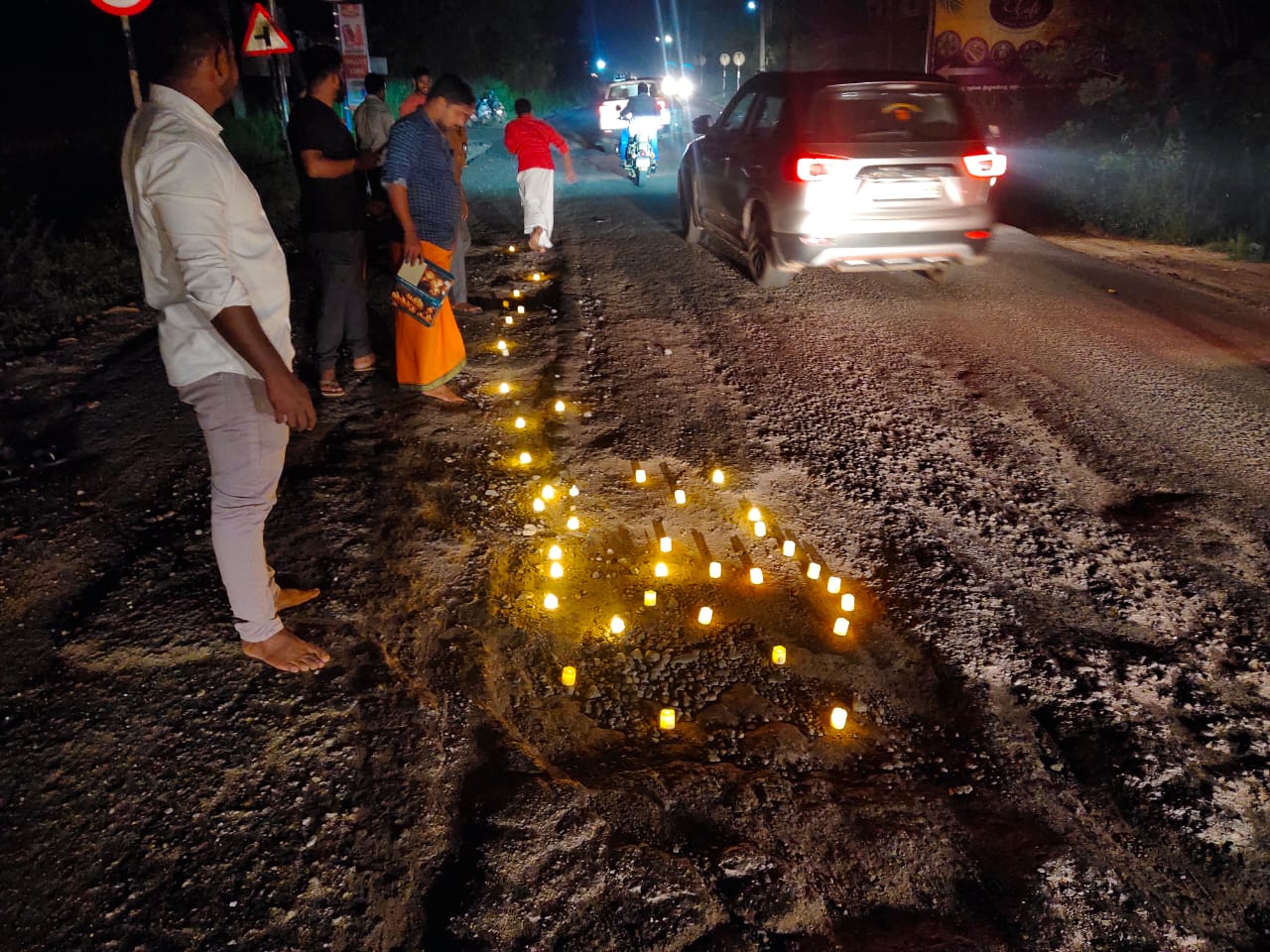 ಬೆಳ್ತಂಗಡಿ: ರಸ್ತೆ ಗುಂಡಿಗಳಲ್ಲಿ ದೀಪಾವಳಿ ಆಚರಿಸಿ ವಿನೂತನ ಪ್ರತಿಭಟನೆ
