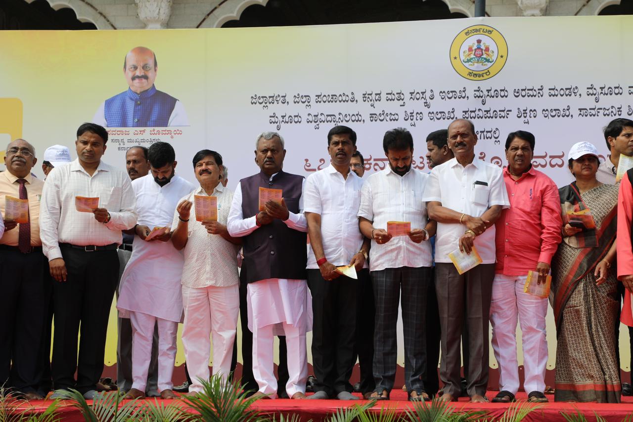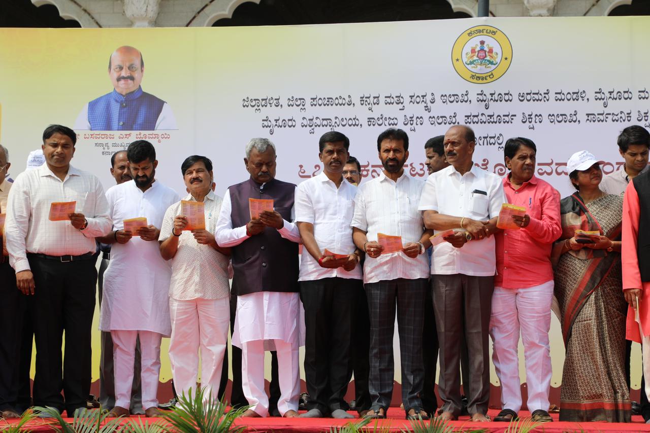 ಮೈಸೂರು, ಅ.28: ಕನ್ನಡ ರಾಜ್ಯೋತ್ಸವದ ಪ್ರಯುಕ್ತ ಮೈಸೂರು ಅರಮನೆ ಮುಂಭಾಗದಲ್ಲಿ ಶುಕ್ರವಾರ ಆಯೋಜಿಸಿದ್ದ ಕೋಟಿ ಕಂಠ ಗಾಯನ ಕಾರ್ಯಕ್ರಮದಲ್ಲಿ ಸಹಕಾರ ಹಾಗೂ ಮೈಸೂರು ಜಿಲ್ಲಾ ಉಸ್ತುವಾರಿ ಸಚಿವ ಎಸ್.ಟಿ.ಸೋಮಶೇಖರ್ ಕನ್ನಡ ಗೀತೆಗಳನ್ನು ಹಾಡಿದರು.