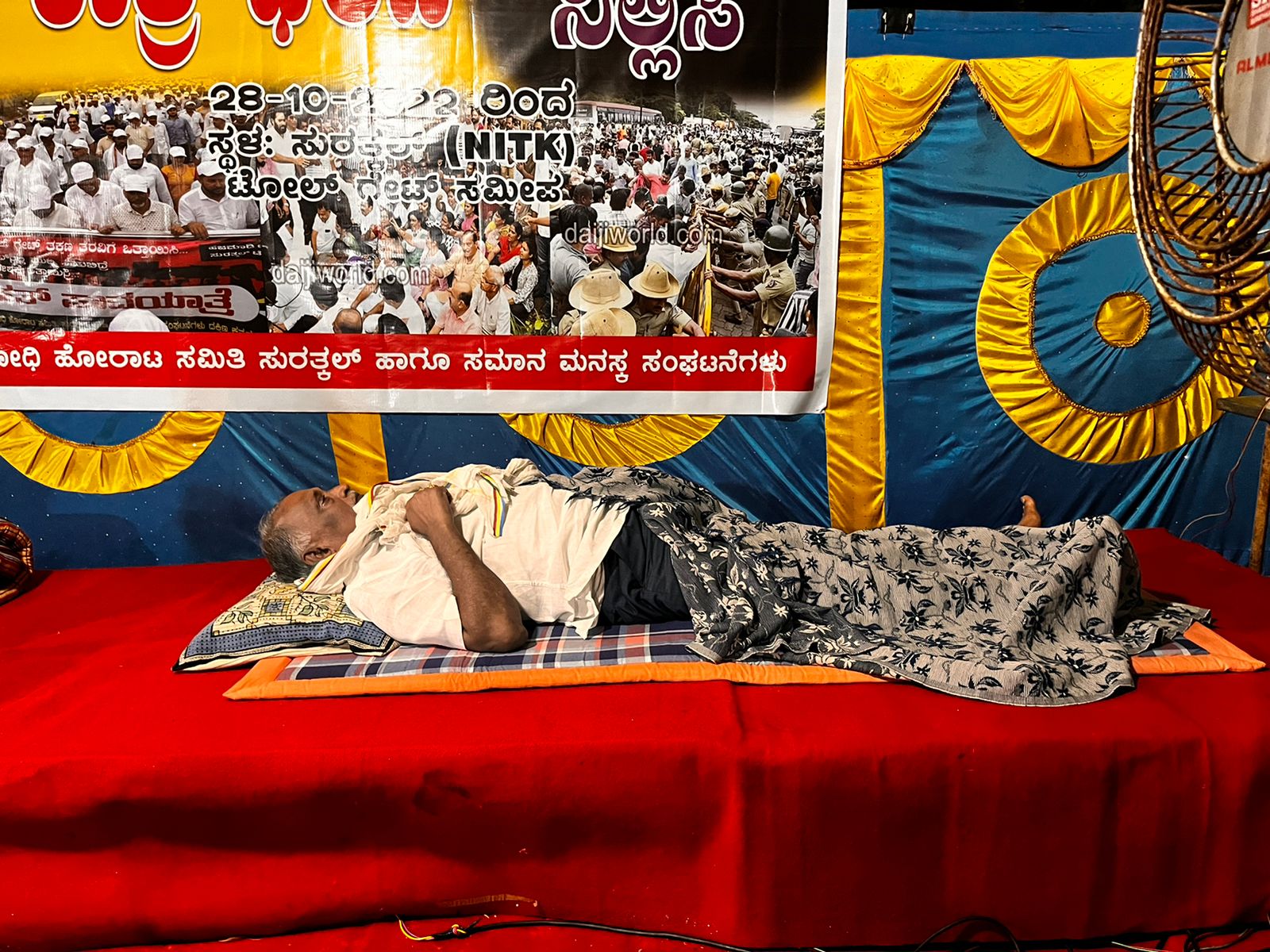 ಸುರತ್ಕಲ್ ಟೋಲ್ ಗೇಟ್ ತೆರವಿಗೆ ಆಗ್ರಹಿಸಿ ಅನಿರ್ದಿಷ್ಟಾವಧಿ ಧರಣಿ: ಚಾಪೆ, ಹೊದಿಕೆಯೊಂದಿಗೆ ಬಂದ ಅಭಯಚಂದ್ರ ಜೈನ್