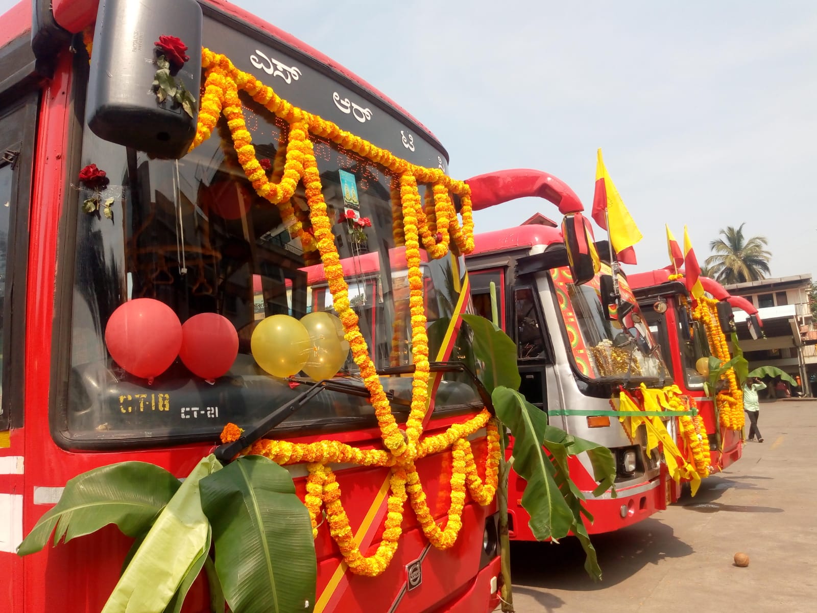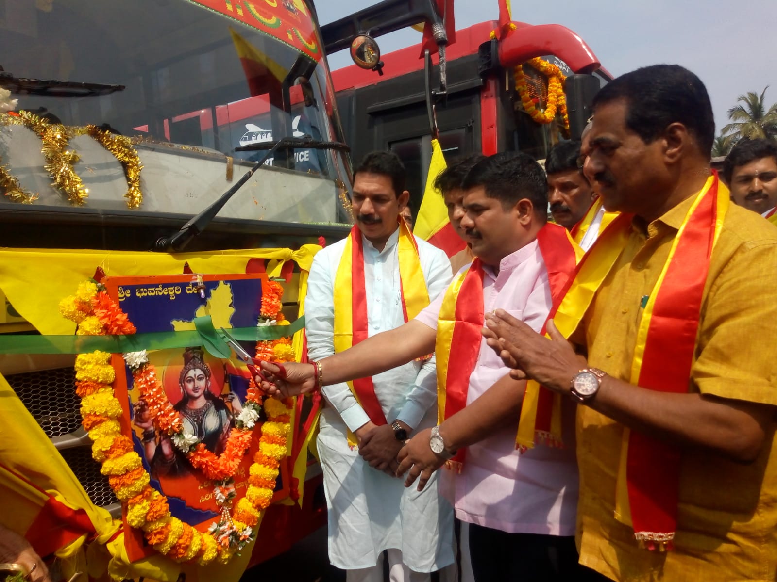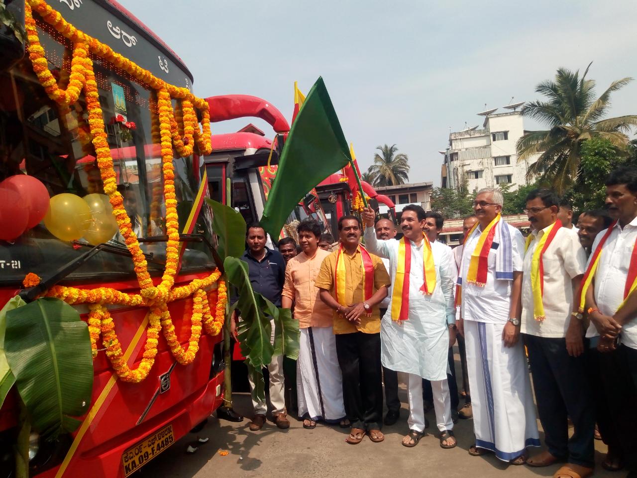ಮಂಗಳೂರು,ನ.1: ಇಲ್ಲಿನ ಅಂತರ್ ರಾಷ್ಟ್ರೀಯ ವಿಮಾನ ನಿಲ್ದಾಣಕ್ಕೆ ಸಂಪರ್ಕ ಕಲ್ಪಿಸುವ ಸಾರಿಗೆಗೆ ನ.1ರ ಕನ್ನಡ ರಾಜ್ಯೋತ್ಸವದಂದು ನಗರದ ಬಿಜೈನಲ್ಲಿರುವ ಕೆ.ಎಸ್.ಆರ್.ಟಿ.ಸಿ ಬಸ್ ನಿಲ್ದಾಣದಲ್ಲಿ ಕರಾವಳಿ ಕನ್ನಡ ತೇರು ಹೆಸರಿನ ಮೂರು ಬಸ್ ಗಳಿಗೆ ಸಂಸದ ನಳಿನ್ ಕುಮಾರ್ ಕಟೀಲು ಚಾಲನೆ ನೀಡಿದರು.