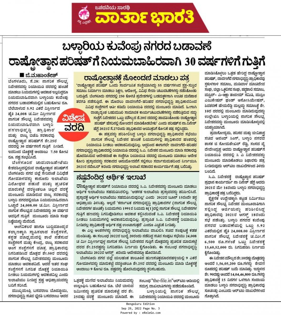ನಾಗರಿಕ ಸೌಲಭ್ಯ ನಿವೇಶನವನ್ನು ರಿಯಾಯಿತಿ ದರದಲ್ಲಿ ಹಂಚಿಕೆ ಮಾಡಲು ನಿಯಮಗಳಲ್ಲಿ ಅವಕಾಶ ಇಲ್ಲದಿದ್ದರೂ ನಿಯಮಬಾಹಿರವಾಗಿ ಬಳ್ಳಾರಿಯ ಕುವೆಂಪು ನಗರದಲ್ಲಿ ರಾಷ್ಟ್ರೋತ್ಥಾನ ಪರಿಷತ್ಗೆ ನಾಗರಿಕ ಸೌಲಭ್ಯ ನಿವೇಶನವನ್ನು ಗುತ್ತಿಗೆ ನೀಡಿದ್ದನ್ನು ವಾರ್ತಾಭಾರತಿ-‘the-file.in’ ದಾಖಲೆ ಸಹಿತ ವರದಿ ಪ್ರಕಟಿಸಿತ್ತು.
