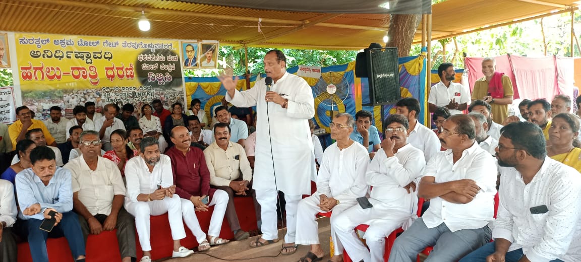 ಸುರತ್ಕಲ್ ಟೋಲ್ಗೇಟ್ ತೆರವಿಗೆ ಆಗ್ರಹಿಸಿ ಟೋಲ್ಗೇಟ್ ವಿರೋಧಿ ಹೋರಾಟ ಸಮಿತಿ ಮತ್ತು ಸಮಾನ ಮನಸ್ಕ ಸಂಘಟನೆಗಳು ನಡೆಸುತ್ತಿರುವ ರಾತ್ರಿ- ಹಗಲು ಅನಿರ್ಧಿಷ್ಟಾವಧಿ ಧರಣಿಗೆ ಟೆಂಪೊ ಚಾಲಕ ಮಾಲಕರ ಬೃಹತ್ ರ್ಯಾಲಿಯ ಜೊತೆ ಆಗಮಿಸಿ ಧರಣಿಗೆ ಬೆಂಬಲ ವ್ಯಕ್ತಪಡಿಸಿ ಅವರು ಮಾತನಾಡುತ್ತಿದ್ದರು.