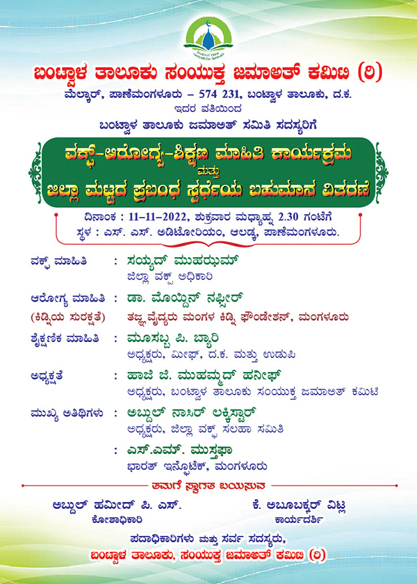 ನ.11: ಬಂಟ್ವಾಳ ಸಂಯುಕ್ತ ಜಮಾಅತ್ ಕಮಿಟಿ ವತಿಯಿಂದ ವಕ್ಫ್, ಆರೋಗ್ಯ ಮತ್ತು ಶಿಕ್ಷಣದ ಬಗ್ಗೆ ಮಾಹಿತಿ