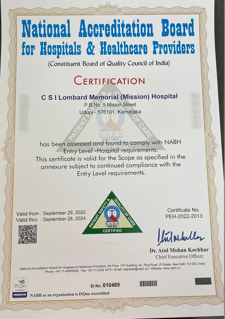 ಎನ್ಎಬಿಎಚ್ ಪ್ರಮಾಣಿಕರಣ ಸಿಎಸ್ಐ ಲೊಂಬಾರ್ಡ್ ಸ್ಮಾರಕ ಆಸ್ಪತ್ರೆಯ ಕಿರೀಟಕ್ಕೊಂದು ಹೊಸ ಗರಿಯಾಗಿದೆ. ಮಿಷನ್ ಆಸ್ಪತ್ರೆಯು ಪ್ರಸ್ತುತ ತನ್ನ ಶತಮಾನೋತ್ಸವ ವರ್ಷವನ್ನು ಆಚರಿಸುತ್ತಿದೆ. ಇದು ಕರಾವಳಿ ಕರ್ನಾಟಕದ ಅತ್ಯಂತ ಹಳೆಯ ಆಸ್ಪತ್ರೆಗಳಲ್ಲಿ ಒಂದಾಗಿದೆ, ಇದನ್ನು ಯುವ ಸ್ವಿಸ್ ಮಿಷನರಿ ವೈದ್ಯೆ ಡಾ.ಇವಾ ಲೊಂಬಾರ್ಡ್ 1923ರಲ್ಲಿ ಸ್ಥಾಪಿಸಿದ್ದರು. ಕೇವಲ ಆರು ಹಾಸಿಗೆಗಳಿಂದ ಆರಂಭಗೊಂಡಿರುವ ಆಸ್ಪತ್ರೆಯು ಪ್ರಸ್ತುತ 120 ಹಾಸಿಗೆಗಳ ಸಾಮರ್ಥ್ಯವನ್ನು ಹೊಂದಿದೆ.