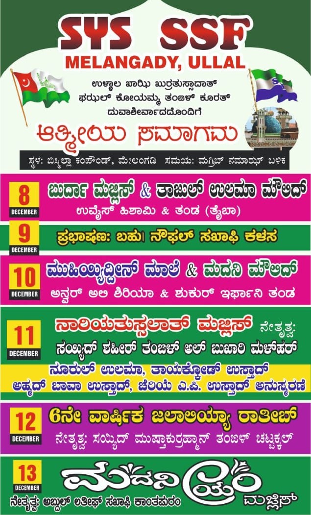 ಕಾರ್ಯಕ್ರಮದಲ್ಲಿ ಬುರ್ದಾ ಮಜ್ಲಿಸ್, ಮದನಿ ಮೌಲಿದ್, ತಾಜುಲ್ ಉಲಮಾ ಮೌಲಿದ್, ಮುಹಿಯ್ಯುದ್ದೀನ್ ಮಾಲೆ, ನಾರಿಯತುಸ್ಸಲಾತ್ ಮಜ್ಲಿಸ್, ಅನುಸ್ಮರಣಾ ಸಂಗಮ, ಜಲಾಲಿಯ್ಯಾ ರಾತೀಬ್, ಮದನೀಯಂ ಮಜ್ಲಿಸ್ ಇತ್ಯಾದಿ ಜರಗಲಿದೆ ಎಂದು ಪ್ರಕಟನೆ ತಿಳಿಸಿದೆ.