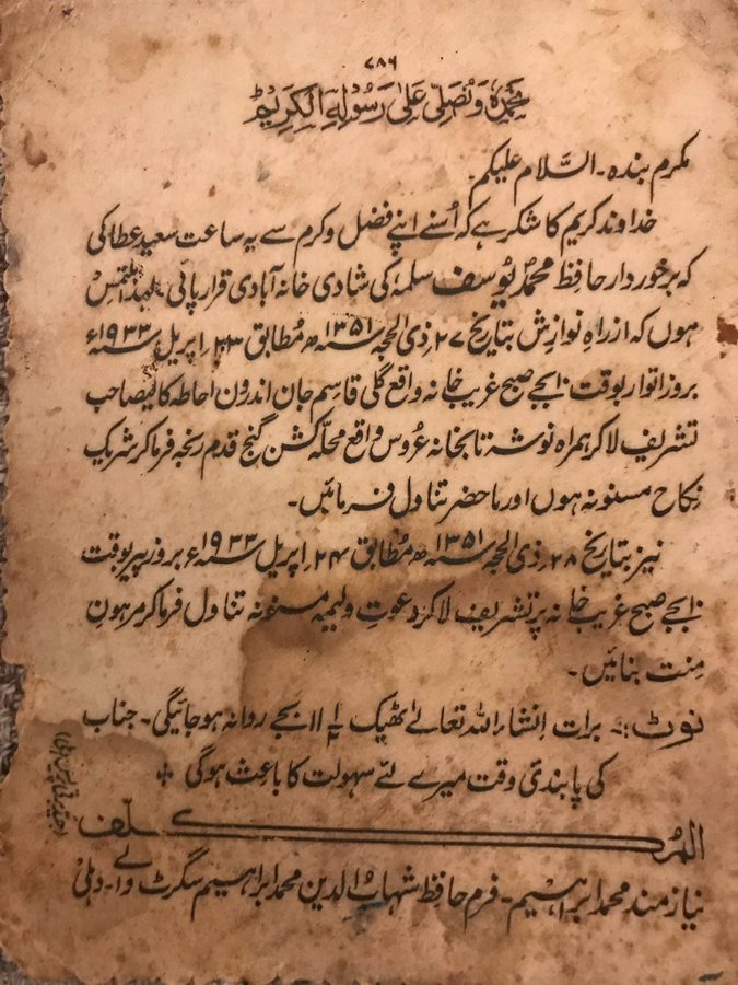 "ಸ್ಟ್ರೀಟ್ ಖಾಸಿಮ್ ಜಾನ್ನಲ್ಲಿರುವ ನನ್ನ ಮನೆಗೆ ಬರಲು ನಾನು ನಿಮ್ಮನ್ನು ಆಹ್ವಾನಿಸುತ್ತೇನೆ, ತದನಂತರ ಕಿಶನ್ ಗಂಜ್ ಪ್ರದೇಶದಲ್ಲಿರುವ ವಧುವಿನ ಮನೆಗೆ ನಿಕ್ಕಾಹ್ (ಪ್ರವಾದಿ ಮುಹಮ್ಮದ್ ಅವರ ಸುನ್ನತ್) ನ ಭಾಗವಾಗಲು ಮತ್ತು ಭೋಜನ ಸವಿಯಲು ನಮ್ಮೊಂದಿಗೆ ಬನ್ನಿ. ವಲೀಮಾ 1933 ಏಪ್ರಿಲ್ 24 ರಂದು / ಝುಲ್-ಹಜ್ 28 ,1351 ರಂದು ನಡೆಯಲಿದೆ. ಬೆಳಿಗ್ಗೆ 10 ಗಂಟೆಗೆ ನನ್ನ ಮನೆಗೆ ಬಂದು ವಲೀಮಾದಲ್ಲಿ ಪಾಲ್ಗೊಳ್ಳಿ" ಎಂದು ಕರೆಯೋಲೆಯಲ್ಲಿ ಮನವಿ ಮಾಡಲಾಗಿದೆ.