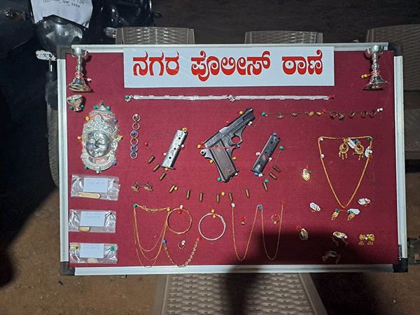 ಚಿಕ್ಕಮಗಳೂರು ಮೂಲದ ಹಾಲಿ ಬೆಂಗಳೂರು ನಿವಾಸಿ ಅಹ್ಮದ್ ಕಬೀರ್(36) ಬಂಧಿತ ಆರೋಪಿ. ನಗರ ಠಾಣೆಯ ಪಿಎಸ್ಸೈ ನಾಗೇಂದ್ರ ನಾಯ್ಕ ಜ.2ರಂದು ಮಧ್ಯರಾತ್ರಿ ಗಸ್ತಿನಲ್ಲಿದ್ದ ವೇಳೆ ನಗರದ ಕಲ್ಯಾಣ ನಗರ ಬಡಾವಣೆ ವ್ಯಾಪ್ತಿಯಲ್ಲಿ ಕಾರೊಂದರಲ್ಲಿ ಅನುಮಾನಸ್ಪದವಾಗಿ ತಿರುಗಾಡುತ್ತಿರುವುದನ್ನು ಗಮನಿಸಿದ್ದಾರೆ. ಈ ಹಿನ್ನೆಲೆಯಲ್ಲಿ ತಡೆದು ಪರಿಶೀಲಿಸಿದಾಗ ಕಾರಿನಲ್ಲಿ ಪಿಸ್ತೂಲ್, ರಾಡ್ ಮತ್ತಿತರ ವಸ್ತುಗಳು ಪತ್ತೆಯಾಗಿವೆ. ನಂತರ ಆರೋಪಿಯನ್ನು ವಶಕ್ಕೆ ಪಡದು ವಿಚಾರಣೆಗೊಳಪಡಿಸಿದಾಗ ಆತ ಸುಮಾರು 10 ಕಳ್ಳತನ ಪ್ರಕರಣಗಳಲ್ಲಿ ಭಾಗಿಯಾಗಿರುವುದು ಬೆಳಕಿಗೆ ಬಂದಿದೆ ಎಂದು ಪೊಲೀಸರು ತಿಳಿಸಿದ್ದಾರೆ.
