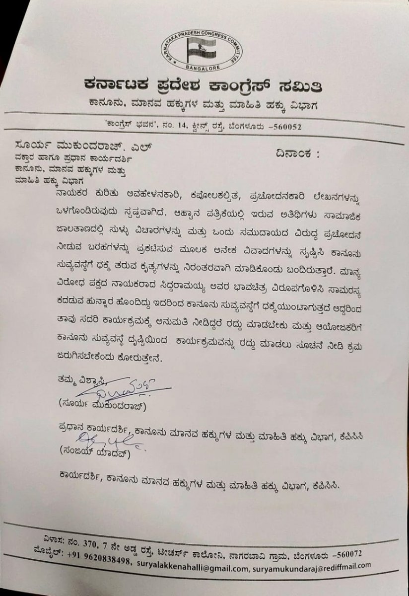 ಬೆಂಗಳೂರಿನ ಎಸ್.ಜೆ ಪಾರ್ಕ್ ಪೊಲೀಸ್ ಠಾಣೆಗೆ ಕೆಪಿಸಿಸಿ ಕಾನೂನು ವಿಭಾಗದ ಪರವಾಗಿ ಸೂರ್ಯ ಮುಕುಂದರಾಜ್ ದೂರು ನೀಡಿದ್ದಾರೆ.
