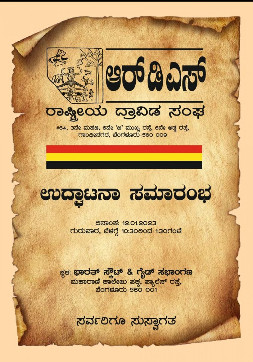 ನಾಳೆ(ಜ.12) ಬೆಂಗಳೂರಿನ ಕೊಂಡಜ್ಜಿ ಬಸಪ್ಪ ಸಭಾಂಗಣದಲ್ಲಿ ರಾಷ್ಟ್ರೀಯ ದ್ರಾವಿಡ ಸಂಘದ ಉದ್ಘಾಟನಾ ಸಮಾರಂಭ ಬೆಳಗ್ಗೆ 10.30ಕ್ಕೆ ಜರುಗಲಿದೆ. ಕಾರ್ಯಕ್ರಮದಲ್ಲಿ ಸಾಹಿತಿ ಡಾ.ಬಂಜಗೆರೆ ಜಯಪ್ರಕಾಶ್, ಕೆಪಿಸಿಸಿ ಕಾಯಾಧ್ಯಕ್ಷ ಸತೀಶ್ ಜಾರಕಿಹೊಳಿ, ಜಾಗತಿಕ ಲಿಂಗಾಯತ ಮಹಾಸಭಾದ ರಾಷ್ಟ್ರೀಯ ಕಾರ್ಯದರ್ಶಿ ಜಿ.ಬಿ.ಪಾಟೀಲ್, ಕ್ರಿಕೆಟ್ ಪಟುವೇದಾ ಕೃಷ್ಣಮೂರ್ತಿ, ಚಿತ್ರ ಸಾಹಿತಿ ಕವಿರಾಜ್ ಸೇರಿದಂತೆ ಪ್ರಮುಖರು ಭಾಗಿಯಾಗಲಿದ್ದಾರೆ.