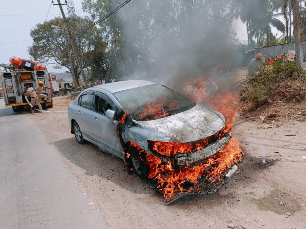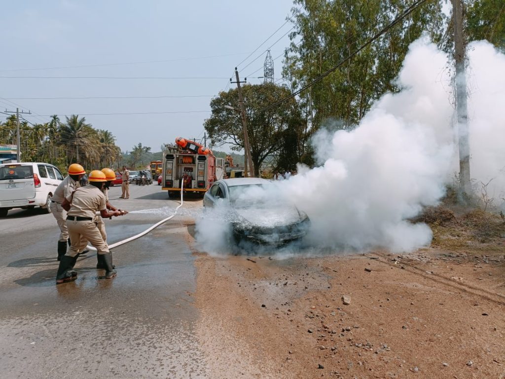 ಕಾರು ಚಲಾಯಿಸುವಾಗ ಕಾರು ಮುಂಭಾಗದಲ್ಲಿ ಏಕಾಏಕಿ ಕಾಣಿಸಿಕೊಂಡಿದ್ದು, ಚಾಲಕ ಶ್ರೀಕಾಂತ್ ತಕ್ಷಣವೇ ಕಾರಿನಿಂದ ಇಳಿದು, ಅಗ್ನಿಶಾಮಕ ಅಧಿಕಾರಿಗಳಿಗೆ ಮಾಹಿತಿ ನೀಡಿದ್ದಾರೆ. ಅಗ್ನಿಶಾಮಕ ಅಧಿಕಾರಿಗಳು – ಸಿಬ್ಬಂದಿ ಬೆಂಕಿ ನಂದಿಸಿದ್ದಾರೆ. ಕಾರಿನ ಮುಂಭಾಗದಲ್ಲಿ ಸಂಪೂರ್ಣ ಸುಟ್ಟು ಹೋಗಿದೆ.