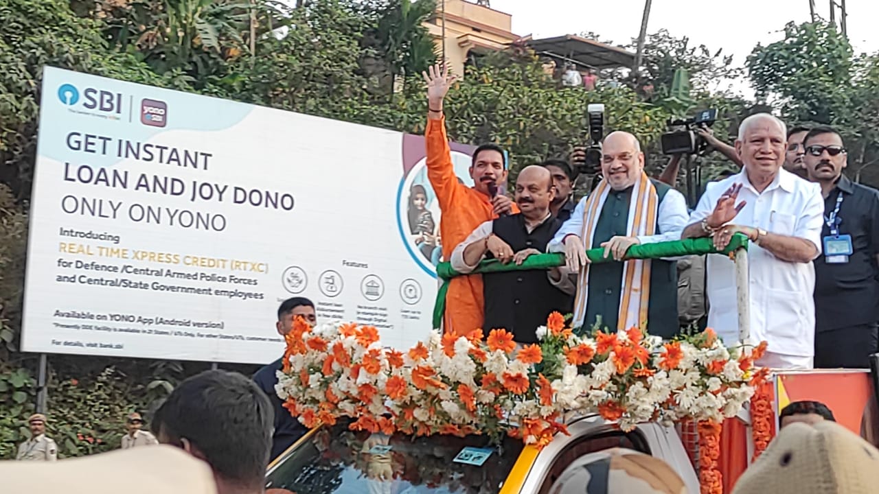 ಮಂಗಳೂರು: ಕೇಂದ್ರ ಗೃಹ ಸಚಿವ ಅಮಿತ್ ಶಾ ಶನಿವಾರ ಮುಸ್ಸಂಜೆ ಮಂಗಳೂರು ವಿಮಾನ ನಿಲ್ದಾಣದ ಹೊರಗೆ ರೋಡ್ ಶೋ ನಡೆಸಿ ಗಮನ ಸೆಳೆದರು.