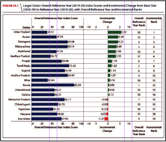 ಭಾರತದ ನೀತಿ ಆಯೋಗ ಸಿದ್ಧಪಡಿಸಿದ 2019-20ನೇ ಸಾಲಿನ ನ್ಯಾಷನಲ್ ಹೆಲ್ತ್ ಇಂಡೆಕ್ಸ್ನಲ್ಲಿ, ದೇಶದ ಒಳ್ಳೆಯ ಆರೋಗ್ಯ ಮೂಲಸೌಕರ್ಯಗಳಿರುವ ರಾಜ್ಯಗಳಲ್ಲಿ ಒಂಭತ್ತನೇ ಸ್ಥಾನದಲ್ಲಿರುವ ಕರ್ನಾಟಕ, ಸುಧಾರಣೆಯ ಕ್ರಮಗಳನ್ನು ಕೈಗೊಳ್ಳುವಲ್ಲಿ ಅತ್ಯಂತ ಕೆಳಗಿನ ಅಂದರೆ ಹತ್ತೊಂಬತ್ತನೇ ಸ್ಥಾನದಲ್ಲಿದೆ. 24 ಅಂಶಗಳನ್ನು ಆಧರಿಸಿ ನೀಡಲಾಗಿರುವ ಈ ಅಂಕಗಳಲ್ಲಿ ಕರ್ನಾಟಕ ಮೈನಸ್ 1.37 ಅಂಕಗಳನ್ನು ಗಳಿಸಿದೆ.
