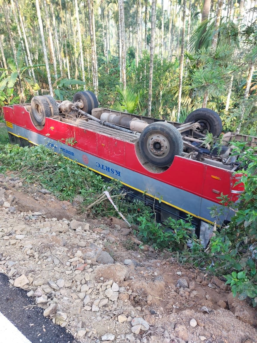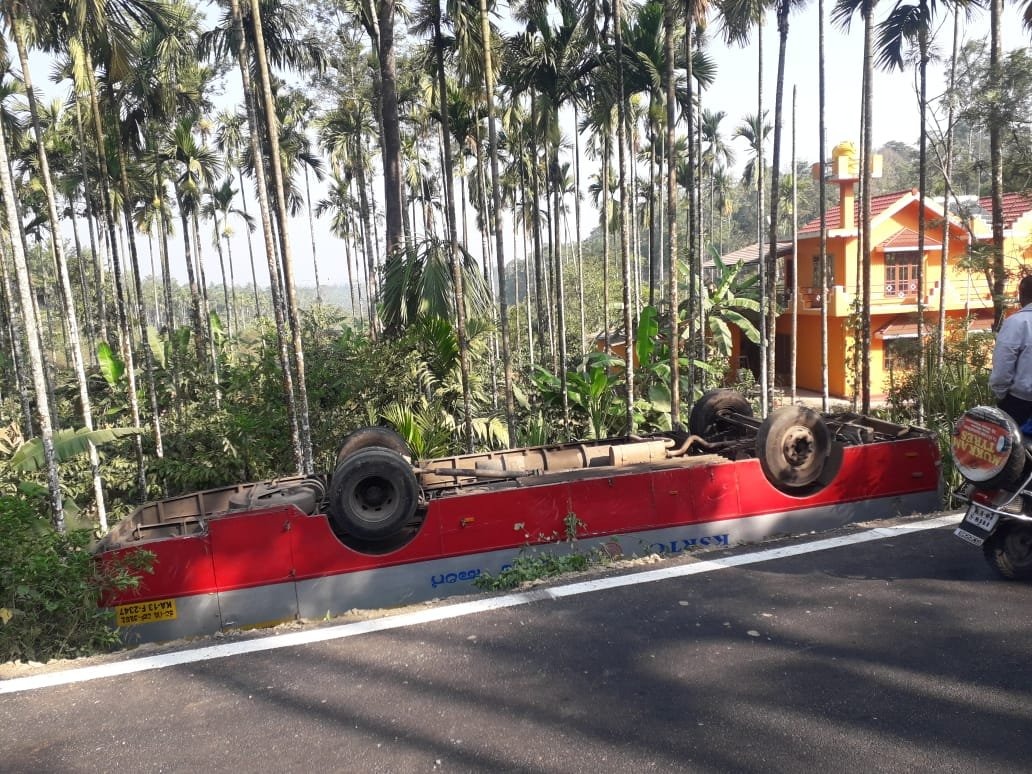 ಹಾಸನ ಡಿಪೋಗೆ ಸೇರಿದ ಬಸ್ ಕೇರಳ ರಾಜ್ಯದ ಎರ್ನಾಕುಲಂ ನಿಂದ ಕೊಡಗಿನ ವಿರಾಜಪೇಟೆ ಮೂಲಕ ಹಾಸನಕ್ಕೆ ತೆರಳುತ್ತಿತ್ತು. ಇಂದು ಮುಂಜಾನೆ 4.30 ಗಂಟೆಯ ಸುಮಾರಿನಲ್ಲಿ ಬಸ್ ಕಂದಕಕ್ಕೆ ಉರುಳಿದೆ. ಚಾಲಕ ಸೇರಿದಂತೆ 40 ಮಂದಿ ಸಣ್ಣಪುಟ್ಟ ಗಾಯಗಳೊಂದಿಗೆ ಅಪಾಯದಿಂದ ಪಾರಾಗಿದ್ದಾರೆ. ದಟ್ಟ ಮಂಜು ಕವಿದಿದ್ದ ಕಾರಣ ಈ ಅವಘಡ ಸಂಭವಿಸಿದೆ ಎಂದು ಹೇಳಲಾಗಿದೆ.