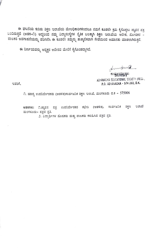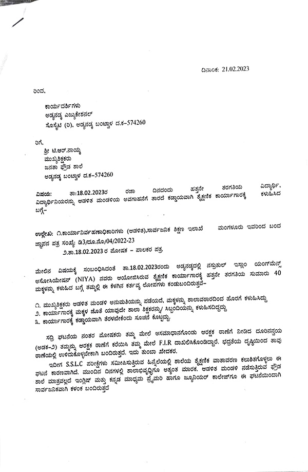 ಫೆ.18ರಂದು 10ನೇ ತರಗತಿಯ ವಿದ್ಯಾರ್ಥಿಗಳನ್ನು ಶೈಕ್ಷಣಿಕ ಕಾರ್ಯಗಾರಕ್ಕೆ ಕಳುಹಿಸಿದ ಹಿನ್ನೆಲೆಯಲ್ಲಿ ಜನತಾ ಪ್ರೌಢಶಾಲೆಯ ಮುಖ್ಯೋಪಾಧ್ಯಾಯರಾದ ಟಿ.ಆರ್. ನಾಯ್ಕ್ ರನ್ನು ತಾತ್ಕಾಲಿಕವಾಗಿ ಸೇವೆಯಿಂದ ಅಮಾನತುಗೊಳಿಸಿ ಅಡ್ಯನಡ್ಕ ಎಜ್ಯುಕೇಶನ್ ನ ಕಾರ್ಯದರ್ಶಿ ಆದೇಶಿಸಿದ್ದಾರೆ ಎಂಬ ಪತ್ರ ವೈರಲ್ ಆಗುತ್ತಿದೆ.