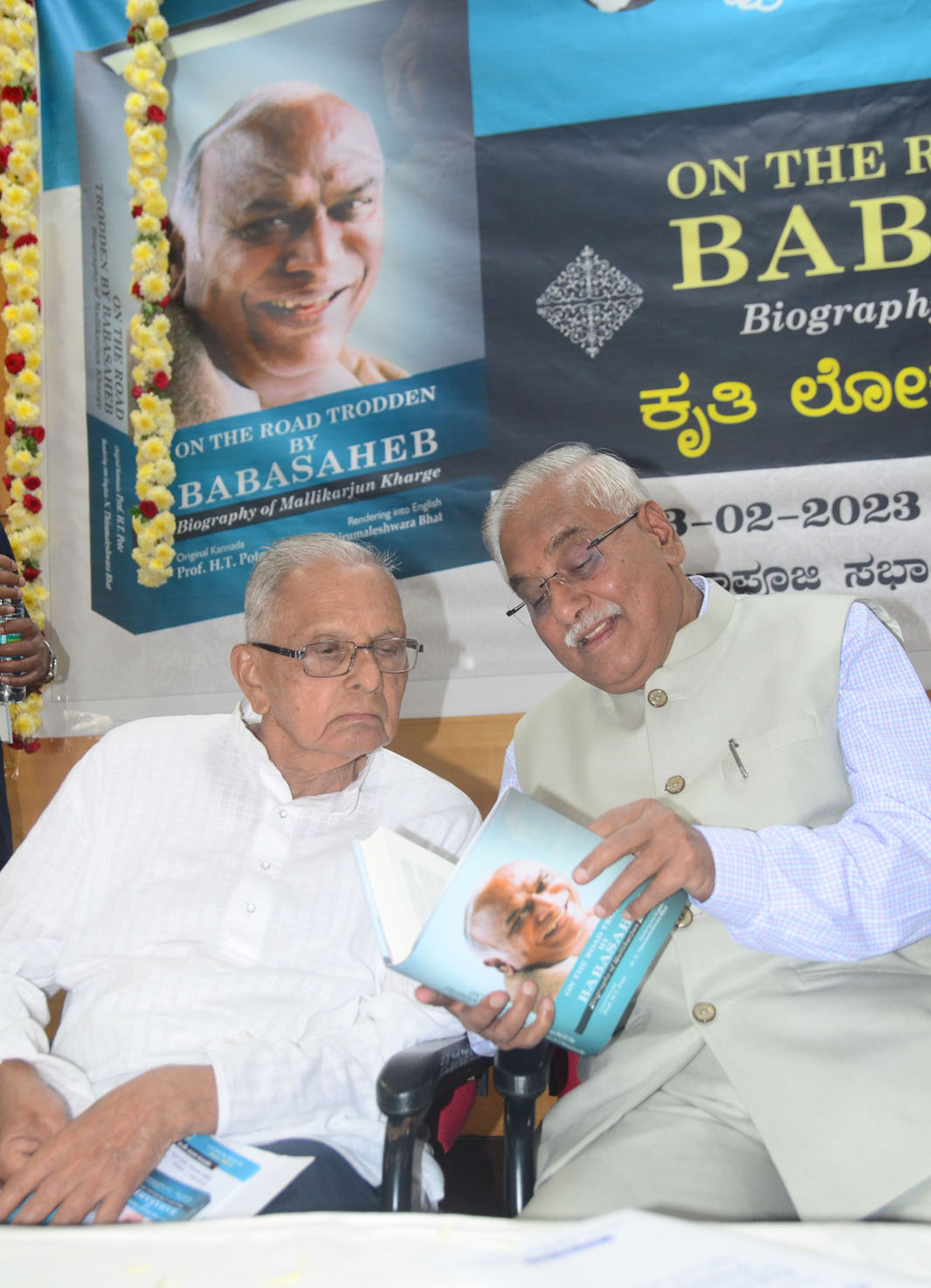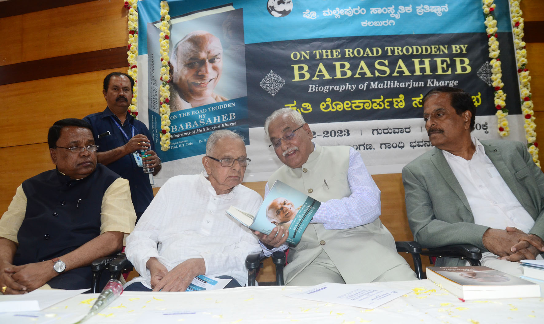 ಗುರುವಾರ ನಗರದ ಗಾಂಧಿ ಭವನದಲ್ಲಿ ಪ್ರೊ. ಮಲ್ಲೇಶ್ವರಂ ಸಾಂಸ್ಕೃತಿಕ ಪ್ರತಿಷ್ಠಾನವು ಆಯೋಜಿಸಿದ್ದ ಎನ್.ತಿರುಮಲೇಶ್ವರ ಭಟ್ಟ ಅನುವಾದಿಸಿದ ‘ಆನ್ ದಿ ರೋಡ್ ಟ್ರೋಡನ್ ಬೈ ಬಾಬಾಸಾಹೇಬ್ ಬಯೋಗ್ರಫಿ ಆಫ್ ಮಲ್ಲಿಕಾರ್ಜುನ ಖರ್ಗೆ’ ಪುಸ್ತಕ ಲೋಕಾರ್ಪಣೆ ಮಾಡಿ ಮಾತನಾಡಿದರು.