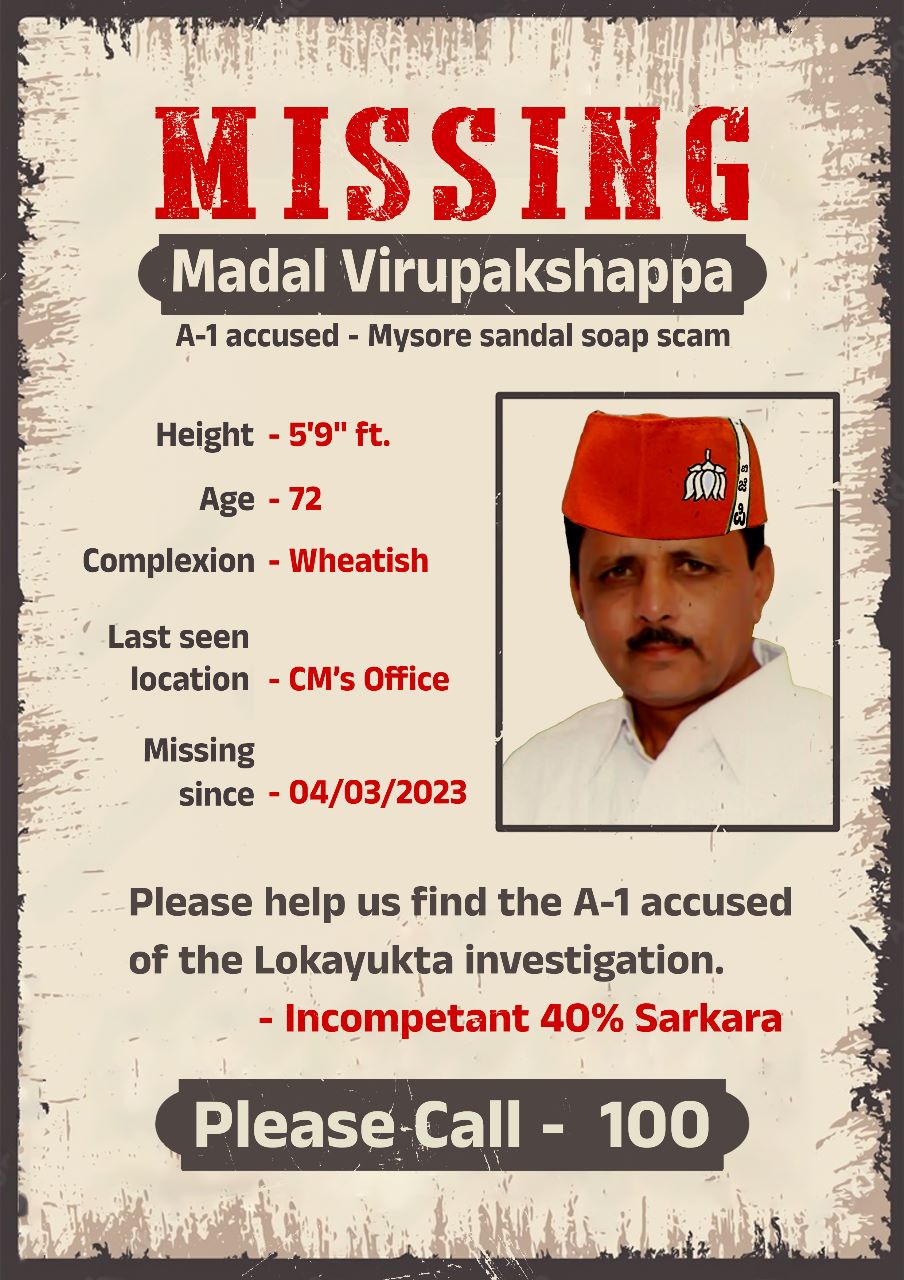 ''ಮಾಡಾಳ್ ವಿರೂಪಾಕ್ಷಪ್ಪ ಮಿಸ್ಸಿಂಗ್, ಹುಡುಕಿಕೊಡಿ...'': ಕಾಂಗ್ರೆಸ್ ನಿಂದ ಪೋಸ್ಟರ್ ಅಭಿಯಾನ
