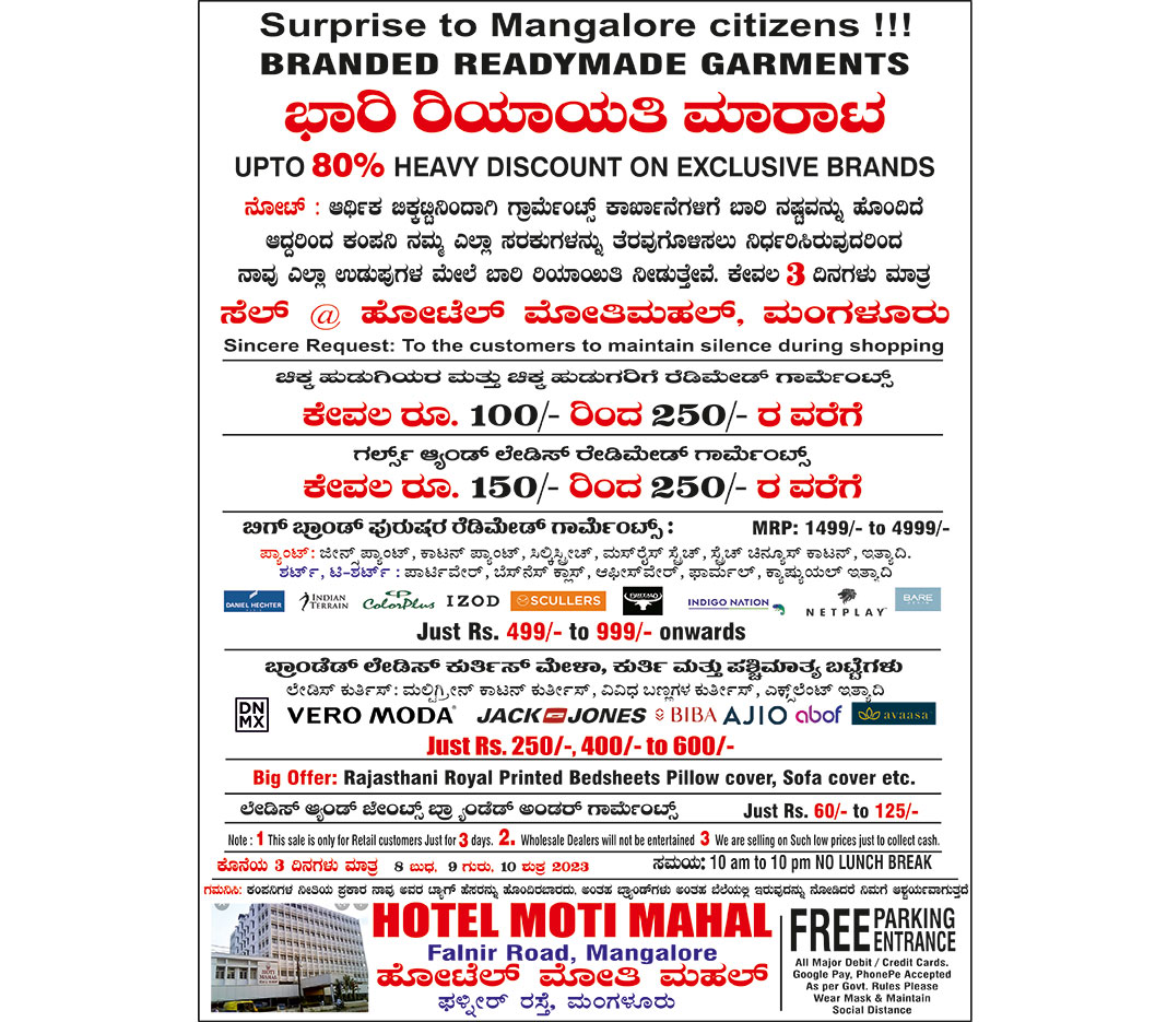 ಮಂಗಳೂರಿನ ಮೋತಿಮಹಲ್ ನಲ್ಲಿ ಬೃಹತ್ ಬ್ರಾಂಡೆಡ್ ರೆಡಿಮೇಡ್ ಗಾರ್ಮೆಂಟ್ಸ್ ಮೇಳ