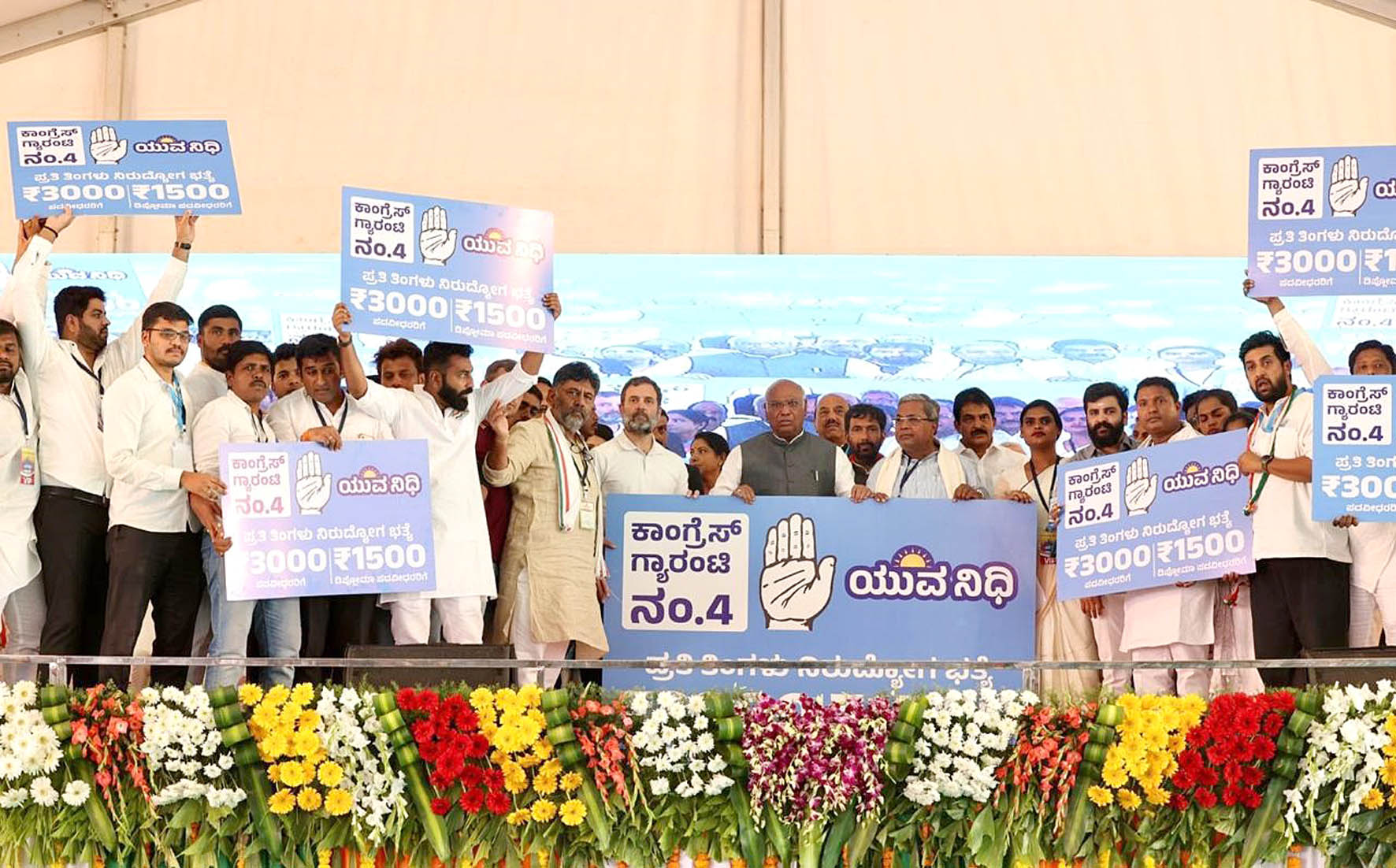 'ಕಾಂಗ್ರೆಸ್ ಪಕ್ಷ ಗೃಹಲಕ್ಷಿ, ಗೃಹಜ್ಯೋತಿ, ಅನ್ನಭಾಗ್ಯ ಹಾಗೂ ಯುವನಿಧಿ ಯೋಜನೆ ಘೋಷಣೆ ನೀಡಲಾಗಿದೆ. ದೇಶದಲ್ಲಿ 50 ಲಕ್ಷ ಸರ್ಕಾರಿ ಹುದ್ದೆ ಖಾಲಿ ಇದ್ದರೂ ಅದನ್ನು ತುಂಬುತ್ತಿಲ್ಲ. ಇವರು ಹೇಳಿದ 2 ಕೋಟಿ ಉದ್ಯೋಗ ಎಲ್ಲಿ ಹೋದವು ಗೊತ್ತಿಲ್ಲ. ರಾಜ್ಯದಲ್ಲಿ 2.50 ಲಕ್ಷ ಉದ್ಯೋಗ ಖಾಲಿ ಇದ್ದು, ನಮ್ಮ ಪಕ್ಷ ಅಧಿಕಾರಕ್ಕೆ ಬಂದ ಒಂದೂವರೆ ವರ್ಷಗಳಲ್ಲಿ ಎಲ್ಲಾ ಹುದ್ದೆ ತುಂಬುತ್ತೇವೆ' ಎಂದು ಭರವೆ ನೀಡಿದರು.