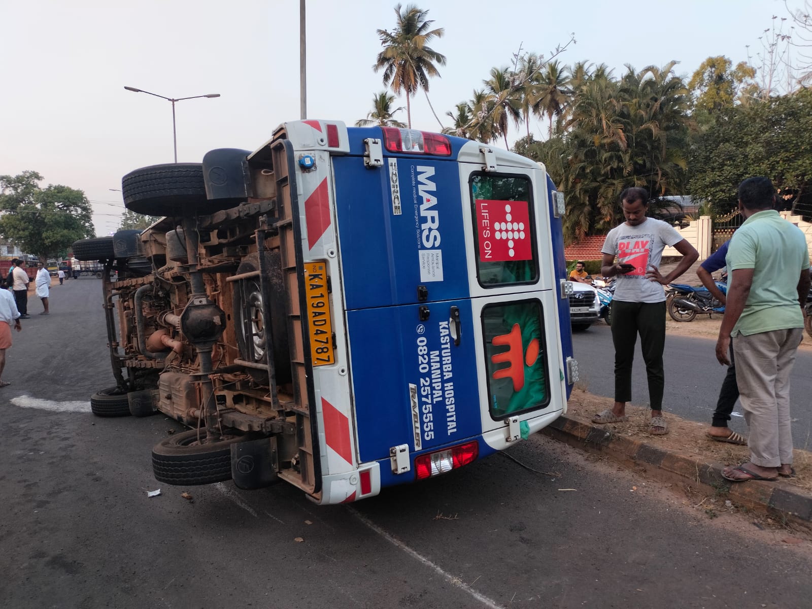 ಎದುರಿನಿಂದ ಬಂದ ಬೈಕ್ ಸವಾರ ಎಡಕ್ಕೆ ತಿರುಗಿಸುವ ವೇಳೆ ಆಂಬುಲೆನ್ಸ್ ಚಾಲಕನ ನಿಯಂತ್ರಣ ತಪ್ಪಿ ಅವಘಡ ಸಂಭವಿಸಿದೆ. ಆಂಬುಲೆನ್ಸ್ ನಲ್ಲಿ ನಾಲ್ಕು ಮಂದಿ ರೋಗಿಗಳು ಸೇರಿ 9 ಮಂದಿ ಇದ್ದರು. ಆಂಬುಲೆನ್ಸ್ ಚಾಲಕ ಸಹಿತ ಇತರರು ಗಾಯಗೊಂಡಿದ್ದಾರೆ ಎಂದು ತಿಳಿದುಬಂದಿದೆ.