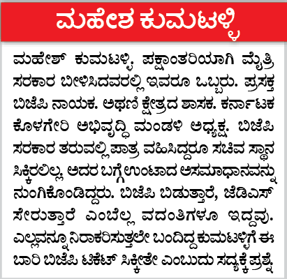 ಇನ್ನೊಂದೆಡೆ, ಕಾಂಗ್ರೆಸ್-ಜೆಡಿಎಸ್ ಸಮ್ಮಿಶ್ರ ಸರಕಾರ ಕೆಡವಿ ಬಿಜೆಪಿ ಸರಕಾರ ರಚಿಸುವಲ್ಲಿ ಮಹತ್ತರ ಪಾತ್ರ ವಹಿಸಿದ್ದ ರಮೇಶ್ ಜಾರಕಿಹೊಳಿ ಈ ಬಾರಿ ಮಹೇಶ್ ಕುಮಟಳ್ಳಿಯ ವರಿಗೇ ಟಿಕೆಟ್ ಕೊಡಬೇಕೆಂದು ಪಟ್ಟು ಹಿಡಿದಿದ್ದಾರೆ. ಅವರಿಗೆ ಟಿಕೆಟ್ ನೀಡದಿದ್ದರೆ ತಾನು ಕೂಡ ಚುನಾವಣೆಯಲ್ಲಿ ಸ್ಪರ್ಧಿಸುವುದಿಲ್ಲ ಎಂದು ಹೈಕಮಾಂಡಿಗೆ ಬಹಿರಂಗ ಸವಾಲು ಹಾಕಿರುವುದು ಚರ್ಚೆಗೆ ಗ್ರಾಸವಾಗಿದೆ.