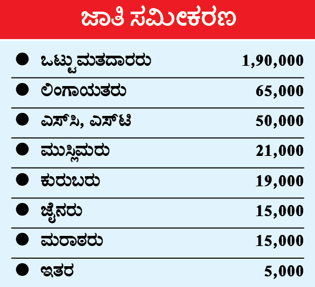 ಮತದಾರರು ಮತ್ತು ಜಾತಿ ಲೆಕ್ಕಾಚಾರವನ್ನು ನೋಡುವು ದಾದರೆ, ಲಿಂಗಾಯತರ ಸಂಖ್ಯೆ ಹೆಚ್ಚಿದೆ. ಜೈನರು, ಕುರುಬರು, ಮಸ್ಲಿಮರು ಕೂಡ ನಿರ್ಣಾಯಕ ಸ್ಥಾನದಲ್ಲಿದ್ದಾರೆ.