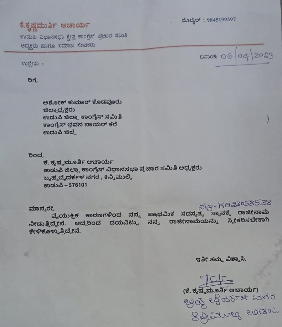 ಉಡುಪಿ, ಎ.6: ಉಡುಪಿ ವಿಧಾನಸಭಾ ಕ್ಷೇತ್ರದ ಕಾಂಗ್ರೆಸ್ ಟಿಕೆಟ್ ಆಕಾಂಕ್ಷಿಯಾಗಿದ್ದ ಕೃಷ್ಣಮೂರ್ತಿ ಆಚಾರ್ಯ ಕಿನ್ನಿಮುಲ್ಕಿ ಕಾಂಗ್ರೆಸ್ ಪಕ್ಷದ ಪ್ರಾಥಮಿಕ ಸದಸ್ಯತ್ವ ಸ್ಥಾನಕ್ಕೆ ರಾಜೀನಾಮೆ ಸಲ್ಲಿಸಿದ್ದಾರೆ.
