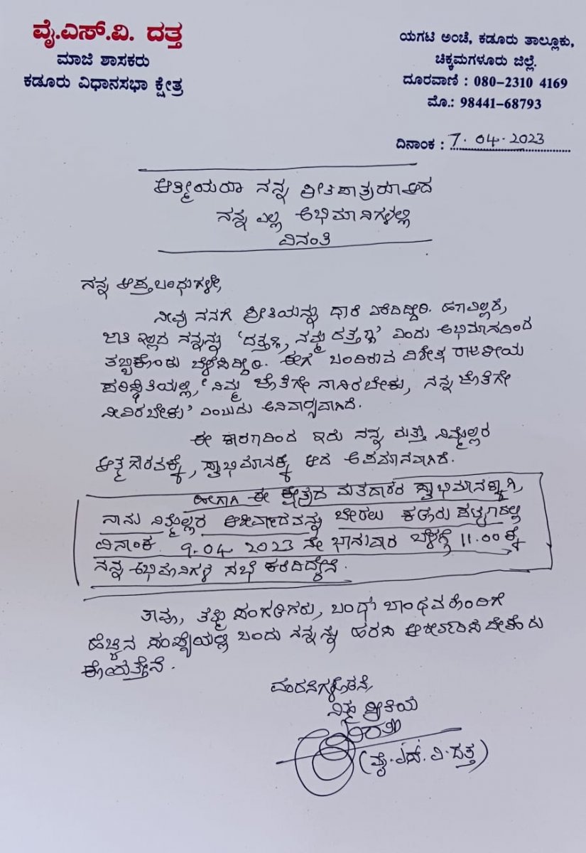 ಕೈತಪ್ಪಿದ ಕಾಂಗ್ರೆಸ್ ಟಿಕೆಟ್: ಭಾವನಾತ್ಮಕ ಪತ್ರ ಬರೆದು ಅಭಿಮಾನಿಗಳ ಸಭೆ ಕರೆದ ವೈಎಸ್ವಿ ದತ್ತ