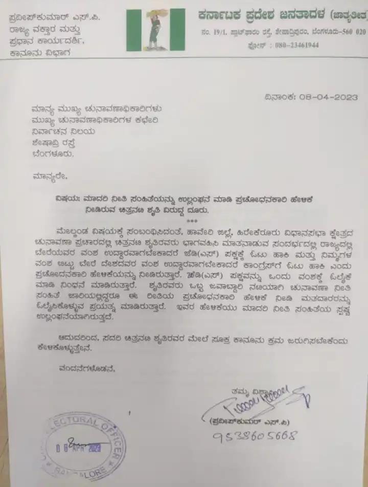 ಈ ರೀತಿಯಾದ ನಟಿ ಶೃತಿ ಪ್ರಚೋದನಕಾರಿ ಭಾಷಣ ಮಾಡಿ ಮತದಾರರನ್ನು ಒಲಿಸಿಕೊಳ್ಳುವ ಯತ್ನ ಮಾಡಿದ್ದಾರೆ . ಅವರ ಈ ಹೇಳಿಕೆ ಮಾದರಿ ನೀತಿ ಸಂಹಿತೆಯ ಸ್ಪಷ್ಟ ಉಲ್ಲಂಘನೆಯಾಗಿದೆ. ಆದ್ದರಿಂದ ಅವರ ಮೇಲೆ ಕ್ರಮ ತೆಗದುಕೊಳ್ಳಿ ಎಂದು ದೂರಿನಲ್ಲಿ ಜೆಡಿಎಸ್ ಆಗ್ರಹಿಸಿದೆ.