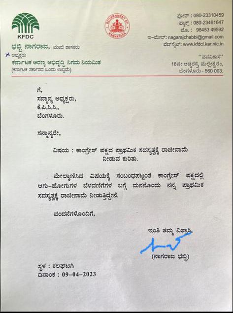 ಈ ಸಂಬಂಧ ಕೆಪಿಸಿಸಿ ಅಧ್ಯಕ್ಷ ಡಿ.ಕೆ ಶಿವಕುಮಾರ್ ಅವರಿಗೆ ರಾಜೀನಾಮೆ ಪತ್ರ ಬರೆದಿರುವ ಅವರು, 'ಕಾಂಗ್ರೆಸ್ ಪಕ್ಷದಲ್ಲಿನ ಆಗು ಹೋಗುಗಳ ಬೆಳವಣಿಗೆ ಬಗ್ಗೆ ಮನನೊಂದು, ಪ್ರಾಥಮಿಕ ಸದಸ್ಯತ್ವಕ್ಕೆ ರಾಜೀನಾಮೆ ನೀಡುತ್ತಿದ್ದನೆ' ಎಂದು ಪತ್ರದಲ್ಲಿ ಉಲ್ಲೇಖಿಸಿದ್ದಾರೆ.