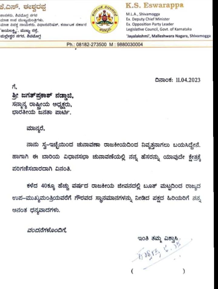 ‘ನಲವತ್ತು ವರ್ಷಗಳ ರಾಜಕೀಯ ಜೀವನದಲ್ಲಿ ಬೂತ್ ಮಟ್ಟದಿಂದ ರಾಜ್ಯದ ಉಪಮುಖ್ಯಮಂತ್ರಿಯ ವರೆಗೂ ಗೌರವದ ಸ್ಥಾನ ನೀಡಿದ ಪಕ್ಷದ ಎಲ್ಲ ಹಿರಿಯರಿಗೆ ನನ್ನ ಅನಂತ ಧನ್ಯವಾದಗಳು’ ಎಂದು ಈಶ್ವರಪ್ಪಅವರು ಪತ್ರದಲ್ಲಿ ತಿಳಿಸಿದ್ದಾರೆ. ಶಿವಮೊಗ್ಗದ ತಮ್ಮ ನಿವಾಸದಲ್ಲೇ ಇರುವ ಈಶ್ವರಪ್ಪ ಅವರು ಇ-ಮೇಲ್ ಮೂಲಕ ನಡ್ಡಾ ಅವರಿಗೆ ಪತ್ರ ರವಾನಿಸಿದ್ದಾರೆ.