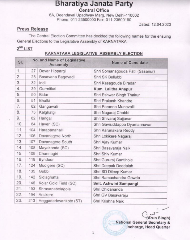 BJP releases the party's second list of 23 candidates for #KarnatakaElections2023