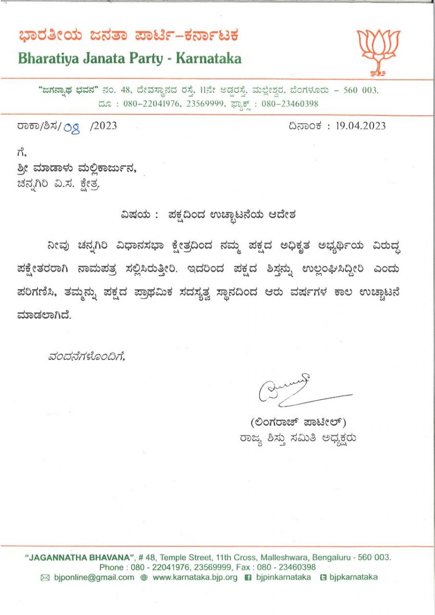 ಬಿಜೆಪಿಯಿಂದ ಟಿಕೆಟ್ ಕೈತಪ್ಪಿದ ಬಳಿಕ ಚನ್ನಗಿರಿ ವಿಧಾನಸಭಾ ಕ್ಷೇತ್ರದಲ್ಲಿ ಬಂಡಾಯ ಅಭ್ಯರ್ಥಿಯಾಗಿ ಸ್ಪರ್ಧಿಸುತ್ತಿರುವ ಶಾಸಕ ಮಾಡಾಳ್ ವಿರೂಪಾಕ್ಷಪ್ಪ ಅವರ ಪುತ್ರ ಮಾಡಾಳ್ ಮಲ್ಲಿಕಾರ್ಜುನ ಅವರನ್ನು ಪಕ್ಷ ವಿರೋಧಿ ಚಟುವಟಿಕೆ ಆರೋಪದಲ್ಲಿ ಆರು ವರ್ಷಗಳ ಅವಧಿಗೆ ಬಿಜೆಪಿಯಿಂದ ಉಚ್ಛಾಟನೆ ಮಾಡಲಾಗಿದೆ.