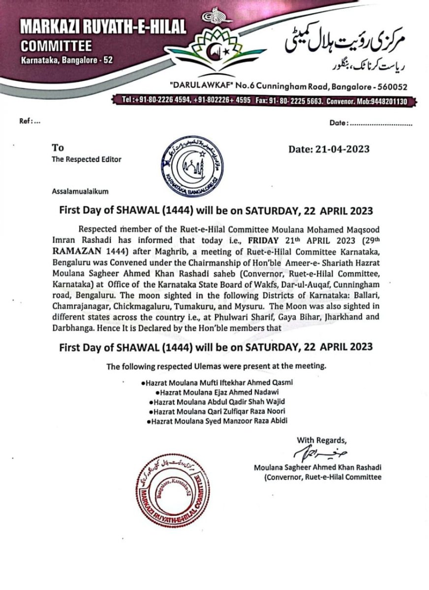 ಬಳ್ಳಾರಿ, ತಿಪಟೂರು, ಬಾಗೇಪಲ್ಲಿ, ಚಾಮರಾಜನಗರ ಹಾಗೂ ಮೈಸೂರು ಸೇರಿದಂತೆ ವಿವಿಧ ಭಾಗಗಳಲ್ಲಿ ಚಂದ್ರದರ್ಶನವಾಗಿರುವ ಮಾಹಿತಿ ಸಿಕ್ಕಿದೆ. ಅಲ್ಲದೆ, ದೇಶದ ವಿವಿಧ ರಾಜ್ಯಗಳಲ್ಲಿಯೂ ಚಂದ್ರದರ್ಶನ ಆಗಿರುವುದರಿಂದ ಉಲಮಾಗಳು ಶನಿವಾರ(ಎ.22) ಈದುಲ್ ಫಿತ್ರ್ ಆಚರಿಸಲು ತೀರ್ಮಾನಿಸಿದ್ದಾರೆ ಎಂದು ಅವರು ಹೇಳಿದರು.