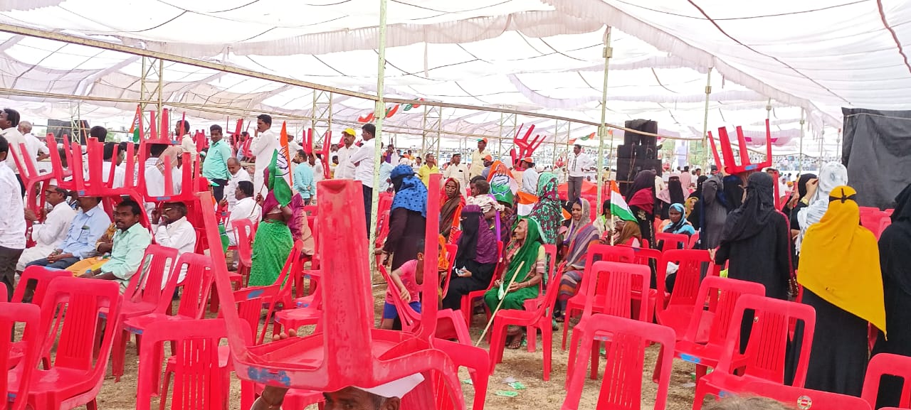 ಕಲಬುರಗಿ: ಜಿಲ್ಲೆಯ ಜೇರ್ವಗಿ ಪಟ್ಟಣದ ಸಾರ್ವಜನಿಕ ಕ್ರೀಡಾಂಗಣದಲ್ಲಿ ಹಮ್ಮಿಕೊಂಡಿರುವ ಬೃಹತ್ ಸಮಾವೇಶದ ಆರಂಭದಲ್ಲೇ ಭಾರೀ ಮಳೆ ಸುರಿದಿದೆ. ಆದರೆ, ಗುಡುಗು ಮಳೆಯ ಮಧ್ಯೆಯೂ ಜನರು ರಾಹುಲ್ ಗಾಂಧಿ ಭಾಷಣಕ್ಕಾಗಿ ಕಾದು ನಿಂತಿದ್ದಾರೆ.