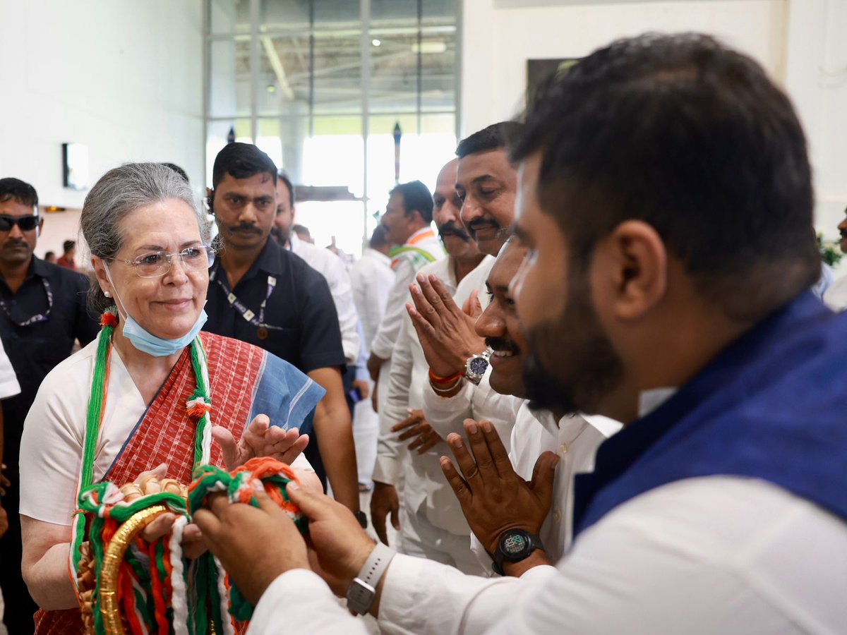 ಶನಿವಾರ ಸಂಜೆ ಹುಬ್ಬಳ್ಳಿ ವಿಮಾನ ನಿಲ್ದಾಣಕ್ಕೆ ಬಂದಿಳಿದ ಸೋನಿಯಾ ಗಾಂಧಿ ಅವರನ್ನು ಕಾಂಗ್ರೆಸ್ ನಾಯಕರು ಬರಮಾಡಿಕೊಂಡರು.