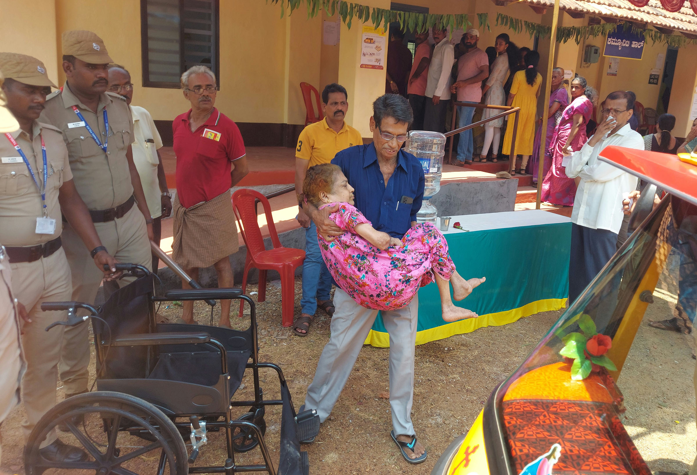 *ಅನಾರೋಗ್ಯ ಪೀಡಿತ ತನ್ನ ಪತ್ನಿ ಬೇಬಿ ಅಮ್ಮನ್ನರನ್ನು ರಿಕ್ಷಾದಿಂದ ಕೊರಂಗ್ರಪಾಡಿ ಗ್ರಾಮದ ಕೆಮ್ತೂರು ಮತಗಟ್ಟೆಗೆ ಹೊತ್ತುಕೊಂಡು ಬಂದ ಪತಿ ಜೇಮ್ಸ್ ಅಮ್ಮನ್ನ.