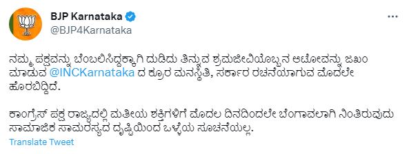 'ನಮ್ಮ ಪಕ್ಷವನ್ನು ಬೆಂಬಲಿಸಿದ್ದಕ್ಕಾಗಿ ದುಡಿದು ತಿನ್ನುವ ಶ್ರಮಜೀವಿಯೊಬ್ಬನ ಆಟೋವನ್ನು ಜಖಂ ಮಾಡುವ ಕಾಂಗ್ರೆಸ್ ನ ಕ್ರೂರ ಮನಸ್ಥಿತಿ, ಸರ್ಕಾರ ರಚನೆಯಾಗುವ ಮೊದಲೇ ಹೊರಬಿದ್ದಿದೆ. ಕಾಂಗ್ರೆಸ್ ಪಕ್ಷ ರಾಜ್ಯದಲ್ಲಿ ಮತೀಯ ಶಕ್ತಿಗಳಿಗೆ ಮೊದಲ ದಿನದಿಂದಲೇ ಬೆಂಗಾವಲಾಗಿ ನಿಂತಿರುವುದು ಸಾಮಾಜಿಕ ಸಾಮರಸ್ಯದ ದೃಷ್ಟಿಯಿಂದ ಒಳ್ಳೆಯ ಸೂಚನೆಯಲ್ಲ' ಎಂದು ರಾಜ್ಯ ಬಿಜೆಪಿ @BJP4Karnataka ಸೋಮವಾರ ಟ್ವೀಟ್ ಮಾಡಿತ್ತು.