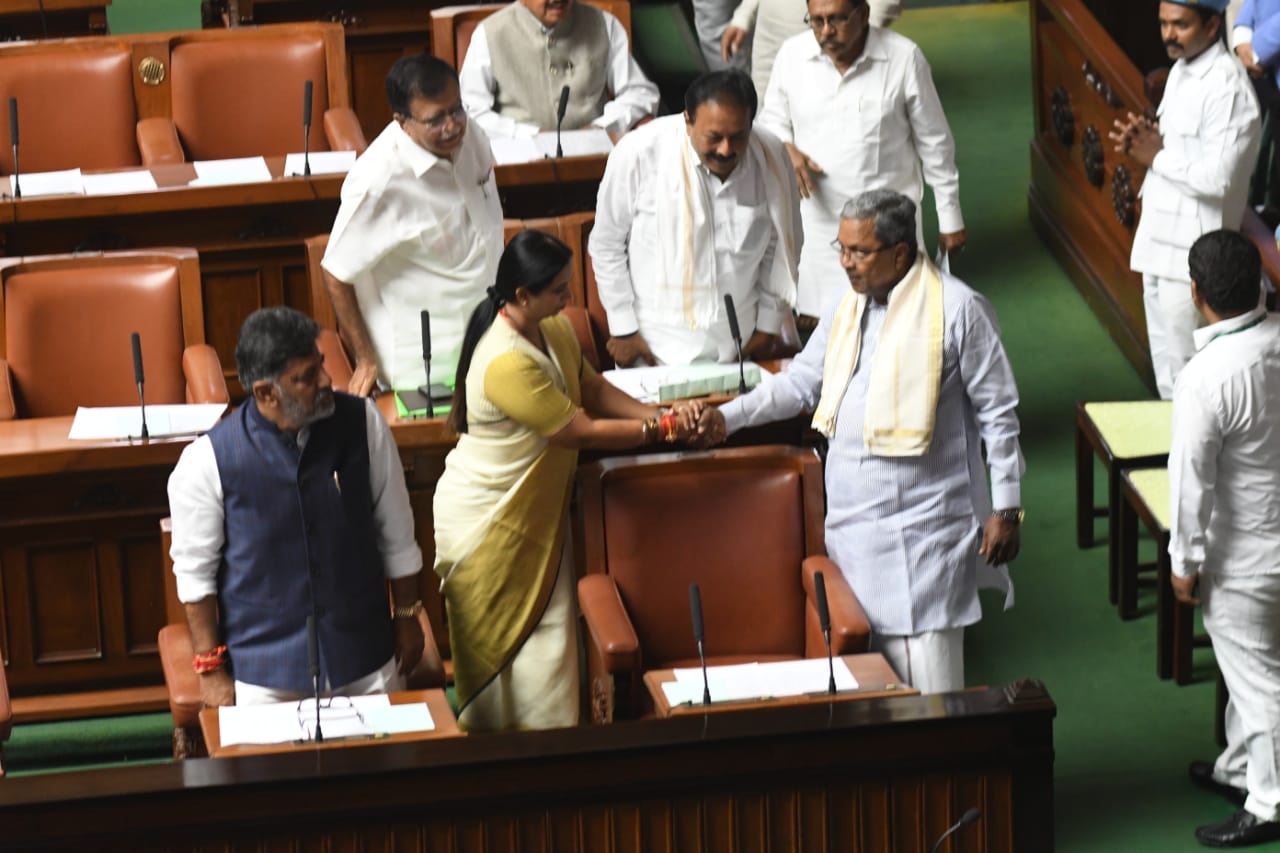 ವರುಣಾ ವಿಧಾನಸಭಾ ಕ್ಷೇತ್ರದಿಂದ ಚುನಾಯಿತರಾಗಿರುವ ಸಿದ್ದರಾಮಯ್ಯ ಅವರು ದೇವರ ಹೆಸರಿನಲ್ಲಿ ಪ್ರಮಾಣ ವಚನ ಸ್ವೀಕರಿಸಿದ ಬಳಿಕ ಸಭಾಧ್ಯಕ್ಷರಿಗೆ ವಂದಿಸಿ ಪ್ರತಿಪಕ್ಷದ ಸಾಲಿನಲ್ಲಿದ್ದ ಮಾಜಿ ಸಿಎಂ ಬಸವರಾಜ ಬೊಮ್ಮಾಯಿ ಮತ್ತಿತರ ಸದಸ್ಯರಿಗೆ ಹಸ್ತಲಾಘವ ಮಾಡಿ ಸ್ವಸ್ಥಾನಕ್ಕೆ ಮರಳಿದರು. ಆನಂತರ, ಕನಕಪುರ ಕ್ಷೇತ್ರದಿಂದ ಆಯ್ಕೆಯಾದ ಉಪ ಮುಖ್ಯಮಂತ್ರಿ ಡಿ.ಕೆ.ಶಿವಕುಮಾರ್ ಅವರು ಗಂಗಾಧರಯ್ಯ ಅಜ್ಜಯ್ಯ ಹೆಸರಿನಲ್ಲಿ ಪ್ರಮಾಣ ಮಾಡಿ ಸತ್ಯನಿಷ್ಠೆಯ ಪ್ರತಿಜ್ಞೆ ಮಾಡಿದರು.