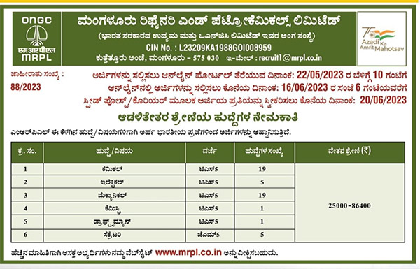 ಮಂಗಳೂರಿನಲ್ಲಿ ಕಾರ್ಯಾಚರಿಸುತ್ತಿರುವ ಭಾರತ ಸರಕಾರದ ಅಧೀನದಲ್ಲಿ ಇರುವ ಸಾರ್ವಜನಿಕ ರಂಗದ ಉದ್ಯಮ MRPL ಆಡಳಿತೇತರ ಶ್ರೇಣಿಯ 50 ಹುದ್ದೆಗಳ ನೇಮಕಾತಿಗೆ ಅರ್ಜಿ ಆಹ್ವಾನಿಸಿ ಪ್ರಕಟನೆ ಹೊರಡಿಸಿದೆ.