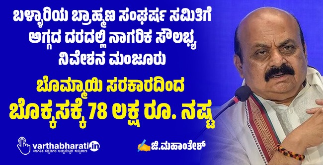 ಬೆಂಗಳೂರು, ಮೇ 22: ಸಂಘಪರಿವಾರ ಹಿನ್ನೆಲೆ ಹೊಂದಿರುವ ರಾಷ್ಟ್ರೋತ್ಥಾನ ಪರಿಷತ್, ಜನಸೇವಾ ಟ್ರಸ್ಟ್ಗೆ ರಿಯಾಯಿತಿ ದರದಲ್ಲಿ ಗೋಮಾಳ, ನಾಗರಿಕ ಸೌಲಭ್ಯ ನಿವೇಶನಗಳನ್ನು ಮಂಜೂರು ಮಾಡಿ ಬೊಕ್ಕಸಕ್ಕೆ ನಷ್ಟ ಉಂಟು ಮಾಡಿರುವ ಪ್ರಕರಣಗಳ ಬೆನ್ನಲ್ಲೇ ಇದೀಗ ಬಳ್ಳಾರಿಯ ಬ್ರಾಹ್ಮಣ ಸಂಘರ್ಷ ಸಮಿತಿಗೂ ಶೇ. 10ರ ದರದಲ್ಲಿ ನಾಗರಿಕ ಸೌಲಭ್ಯ ನಿವೇಶನ ಮಂಜೂರು ಮಾಡಲು ಅನುಮೋದಿಸಿದ್ದ ಹಿಂದಿನ ಮುಖ್ಯಮಂತ್ರಿ ಬಸವರಾಜ ಬೊಮ್ಮಾಯಿ ಅವರು ಪ್ರಾಧಿಕಾರದ ಬೊಕ್ಕಸಕ್ಕೆ 78 ಲಕ್ಷ ರೂ. ನಷ್ಟ ಹೊರಿಸಿರುವುದು ಇದೀಗ ಬಹಿರಂಗವಾಗಿದೆ.