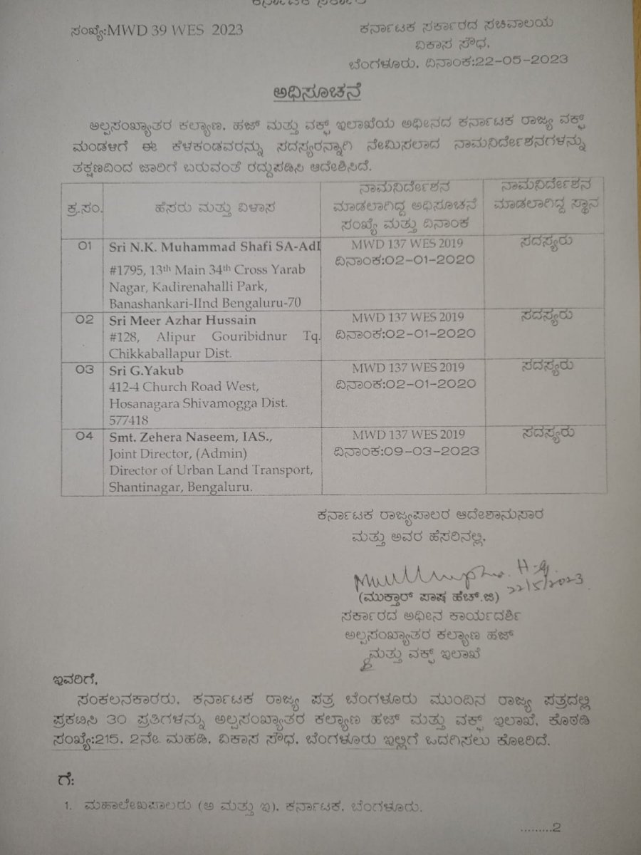 ಶಾಫಿ ಸಅದಿ ಜೊತೆಗೆ ವಕ್ಫ್ ಮಂಡಳಿಯ ಇತರ ಸದಸ್ಯರಾದ ಮೀರ್ ಅಝರ್ ಹುಸೈನ್, ಜಿ.ಯಾಕೂಬ್ ಹಾಗೂ ಐಎಎಸ್ ಅಧಿಕಾರಿ ಝೆಹೆರಾ ನಸೀಮ್ ಅವರ ನಾಮ ನಿರ್ದೇಶನವನ್ನು ರದ್ದುಪಡಿಸಲಾಗಿದೆ.