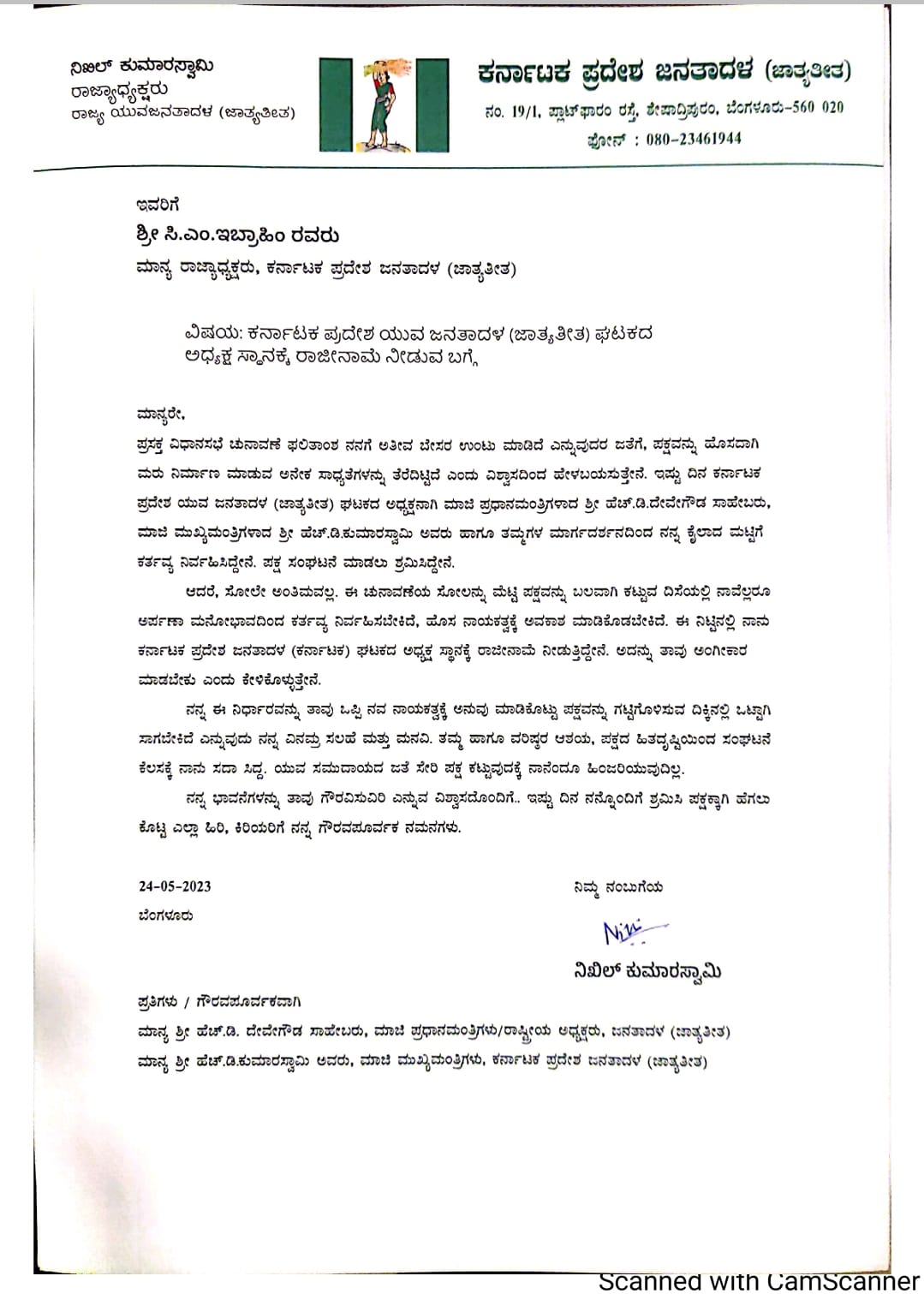 ಬೆಂಗಳೂರು: ಜೆಡಿಎಸ್ ಯುವ ಘಟಕದ ಅಧ್ಯಕ್ಷ ಸ್ಥಾನಕ್ಕೆ ರಾಜೀನಾಮೆ ನೀಡಿರುವ ನಿಖಿಲ್ ಕುಮಾರಸ್ವಾಮಿ ರಾಜ್ಯಾಧ್ಯಕ್ಷ ಸಿಎಂ ಇಬ್ರಾಹಿಂ ಅವರಿಗೆ ರಾಜೀನಾಮೆ ಪತ್ರ ಸಲ್ಲಿಸಿದ್ದಾರೆ.