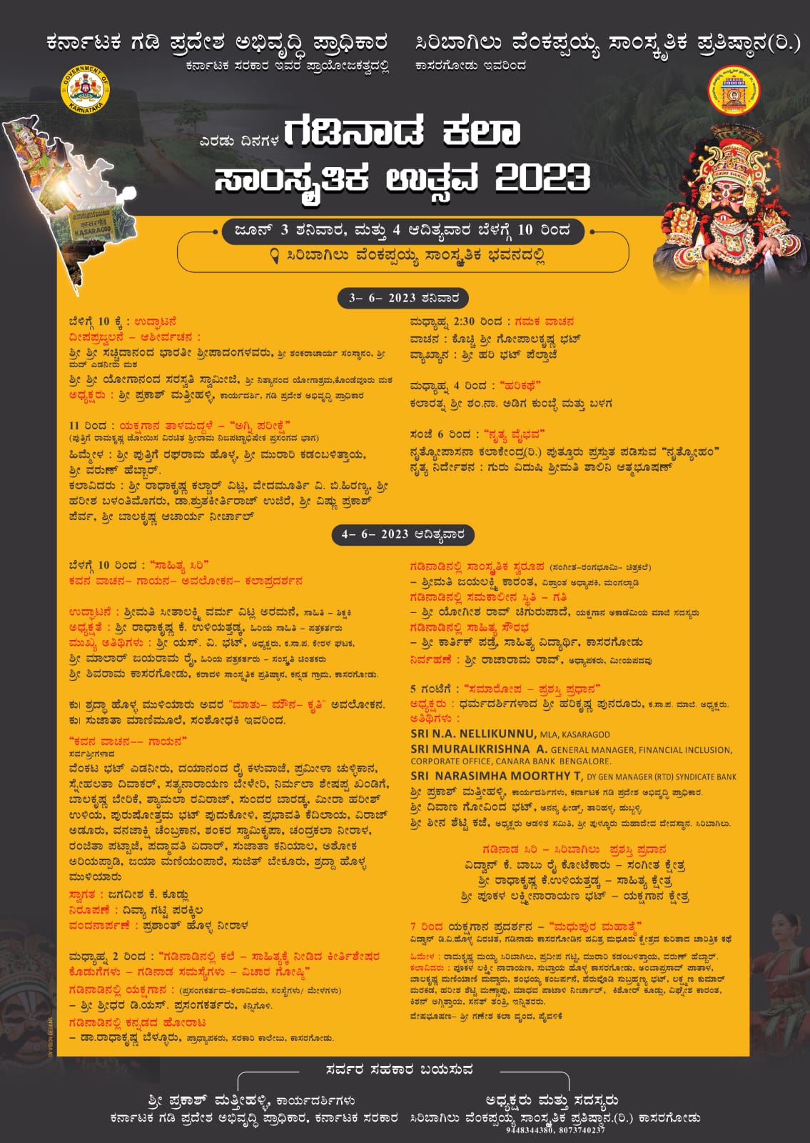 ಕಾಸರಗೋಡು, ಜೂ. 2: ಸಿರಿಬಾಗಿಲು ವೆಂಕಪ್ಪಯ್ಯ ಸಾಂಸ್ಕೃತಿಕ ಪ್ರತಿಷ್ಠಾನದ ನೇತೃತ್ವದಲ್ಲಿ ಕರ್ನಾಟಕ ಗಡಿ ಪ್ರದೇಶ ಅಭಿವೃದ್ಧಿ ಪ್ರಾಧಿಕಾರದ ಪ್ರಾಯೋಜಕತ್ವದಲ್ಲಿ ಜೂ.3 ಮತ್ತು 4ರಂದು 'ಗಡಿನಾಡ ಕಲಾ ಸಾಂಸ್ಕೃತಿಕ ಉತ್ಸವ-2023' ನಡೆಯಲಿದೆ.