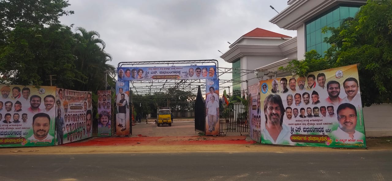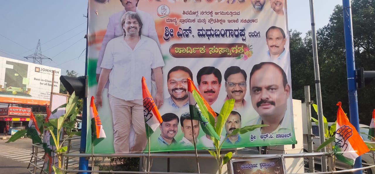 ನಗರದ ಎಂಆರ್ ಎಸ್ ವೃತ್ತದಿಂದ ವೇದಿಕೆ ಕಾರ್ಯಕ್ರಮ ನಡೆಯುವ ಲಗಾನ್ ಮಂದಿರದ ವರೆಗೆ ರಸ್ತೆಯ ಇಕ್ಕೆಲಗಳಲ್ಲಿ ಮಧು ಬಂಗಾರಪ್ಪ ಅವರಿಗೆ ಸ್ವಾಗತಕೋರುವ ಫ್ಲೆಕ್ಸ್, ಬಂಟಿಂಗ್ಸ್ ,ಕಾಂಗ್ರೆಸ್ ಬಾವುಟ ರಾರಾಜಿಸುತ್ತಿವೆ.